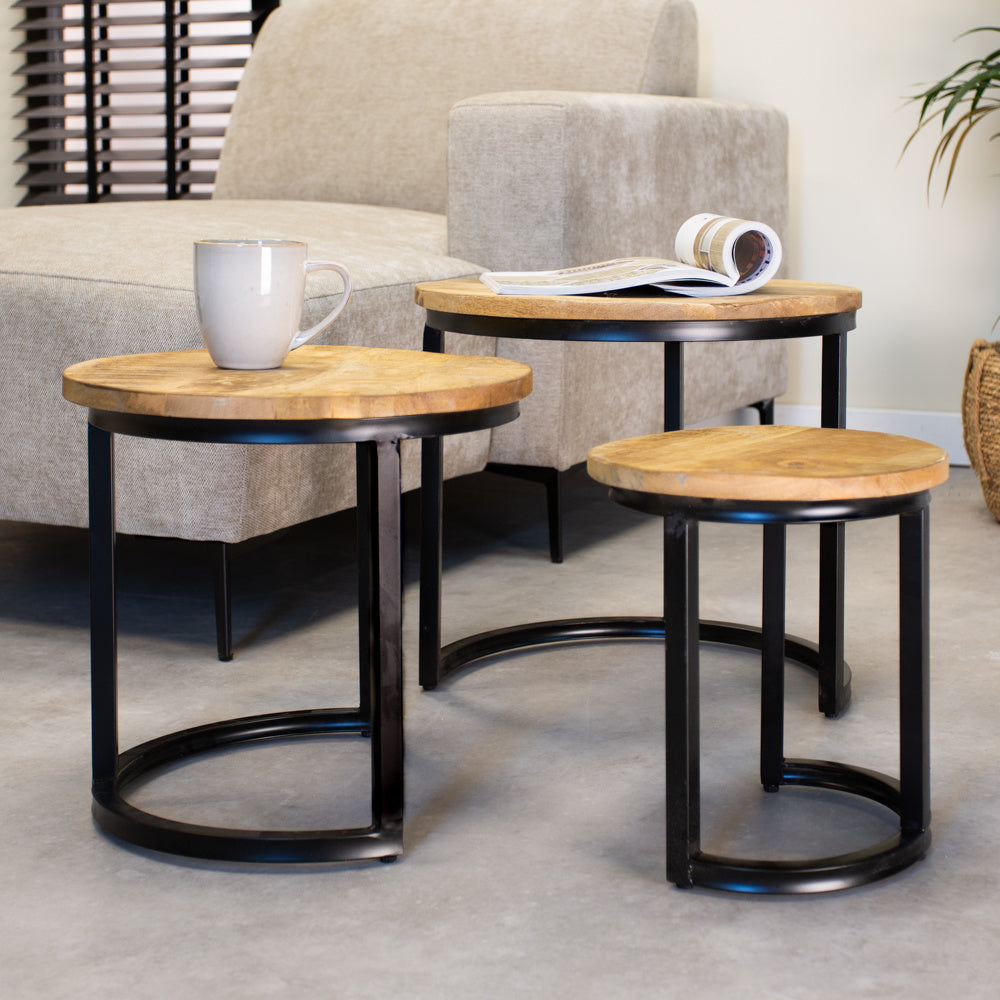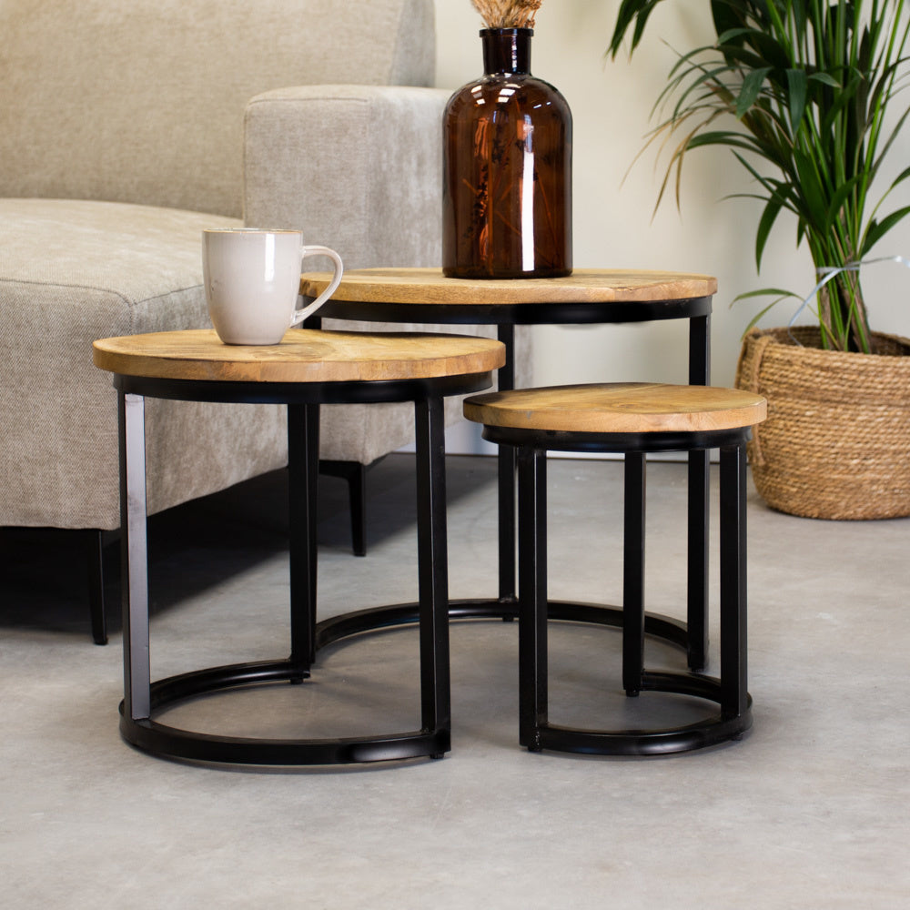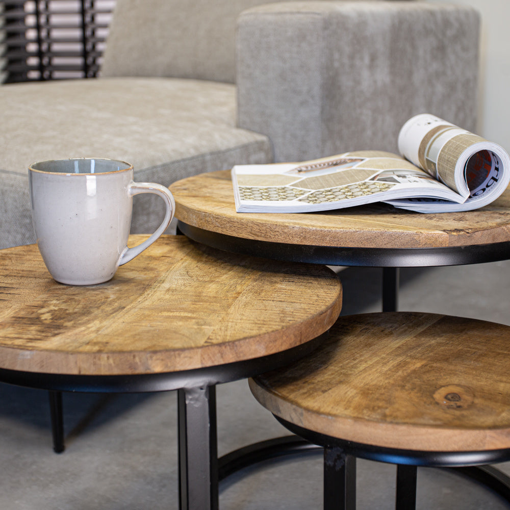 De Oxford is een stoere industriële salontafelset van massief mangohout met een zwart gepoedercoat metalen frame. Deze houten salontafelset bestaat uit maar liefst drie kleine tafeltjes! Geschikt voor kleinere zithoeken.