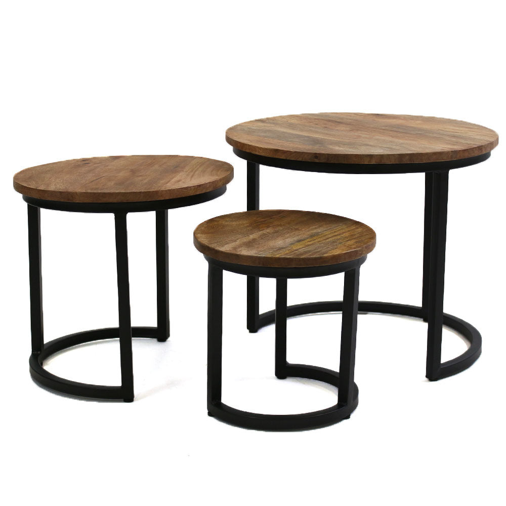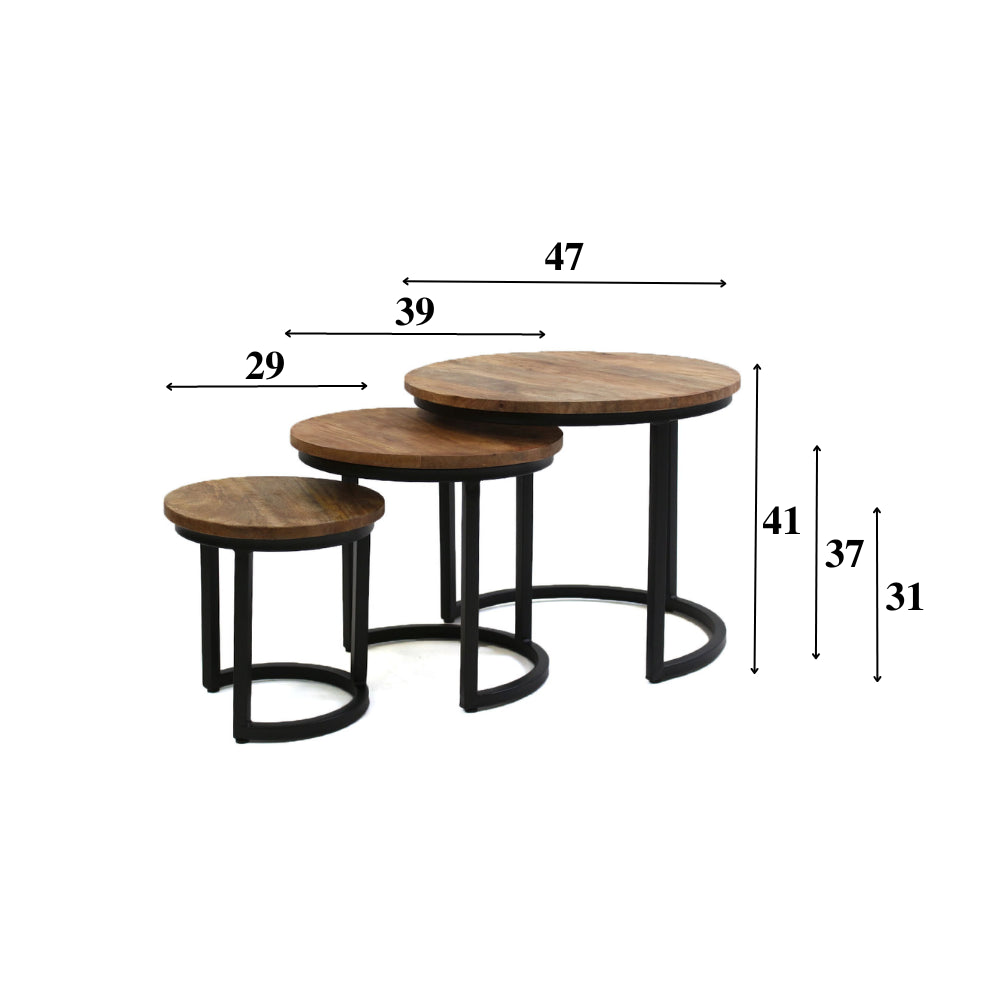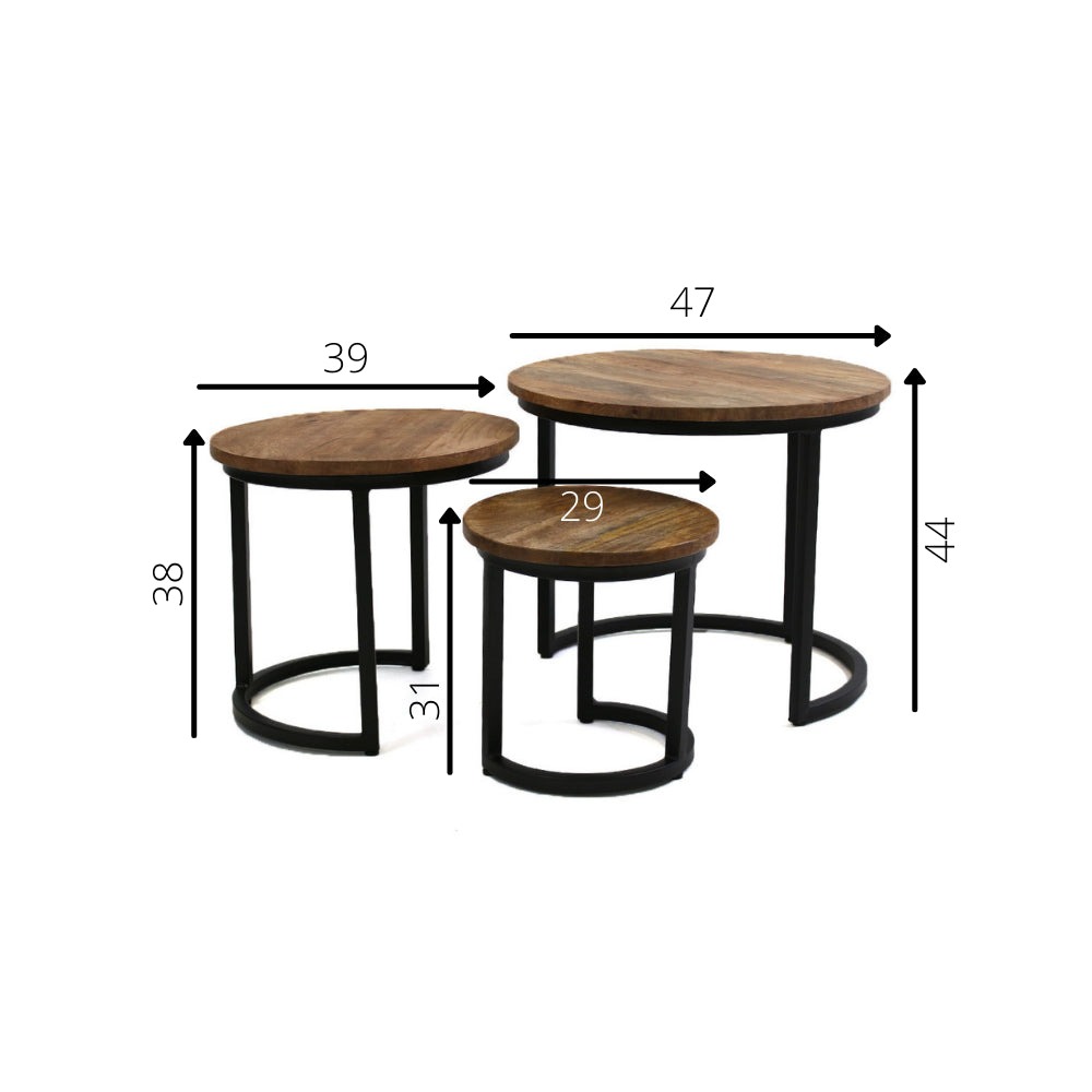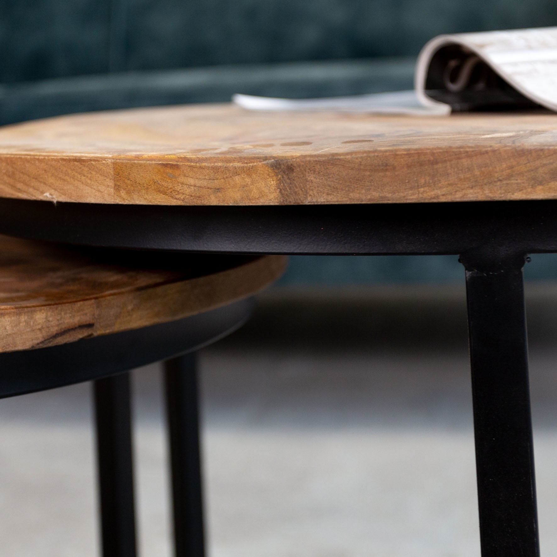 De Oxford is een stoere industriële salontafelset van massief mangohout met een zwart gepoedercoat metalen frame. Deze houten salontafelset bestaat uit maar liefst drie kleine tafeltjes! Geschikt voor kleinere zithoeken.