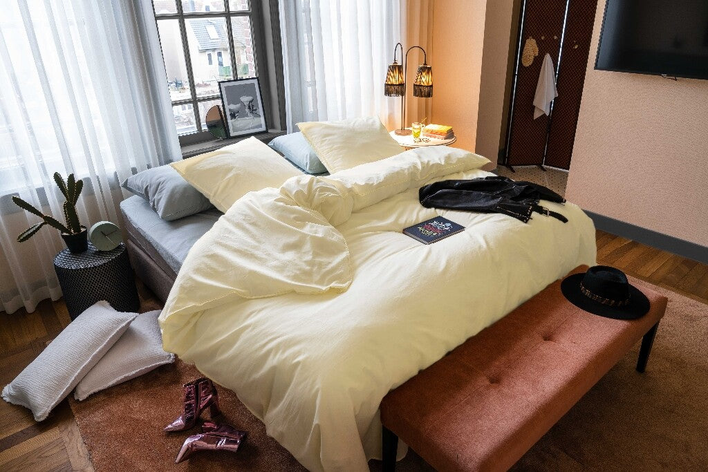 Stay forever cotton but also a little wild met dit super comfy dekbedovertrek! Dit pretty yellow overtrek heeft de perfect little touch doordat het afgewerkt is met een jeans stitching. Samen met de super cute bies die om de sloop heen zit is het overtrek compleet.