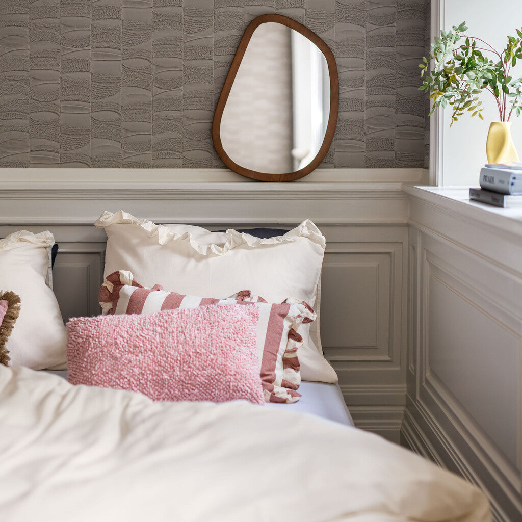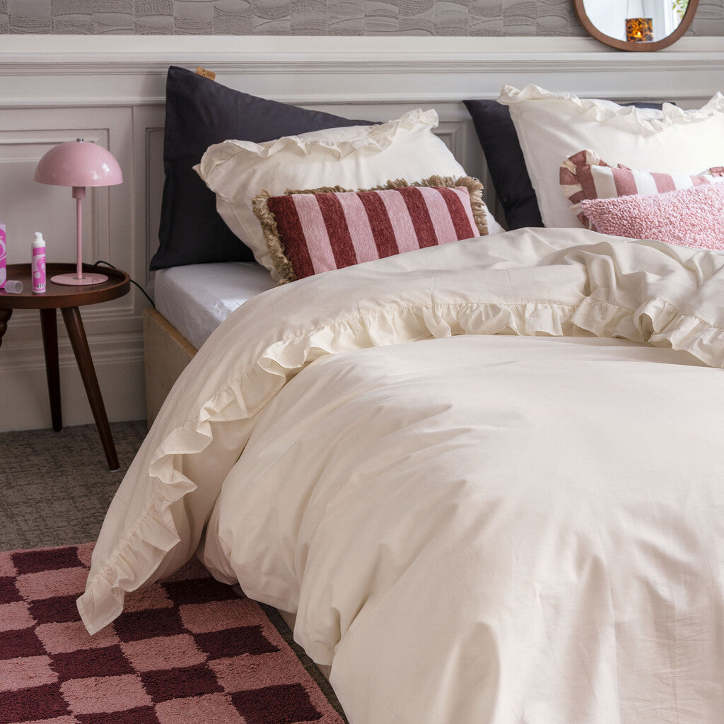 Ontdek het geheim voor een glowy skin met het White Ruffles dekbedovertrek. Deze off-white droom, met een vernieuwende V-volant op het kussen en romantische ruffle-details aan de bovenkant, geeft je slaapkamer een zachte en vrouwelijke look. Gemaakt van 70% recycled cotton, heeft het overtrek niet alleen een superzachte touch, maar is het ook nog eens huidvriendelijk doordat het ademend en vochtregulerend is. Elke nacht voelt aan als een beauty slaapje, waarbij je huid kan ademen én gehydrateerd blijft. Romantic Ruffle ontmoet skincare secret – perfect voor wie een glowy skin wil. All day, every day! Alles op een rij: