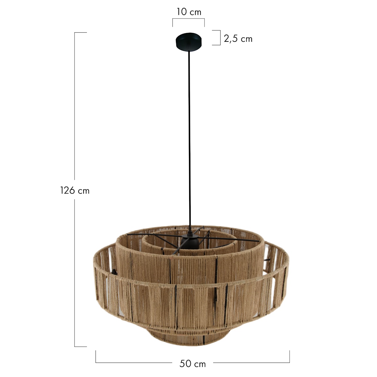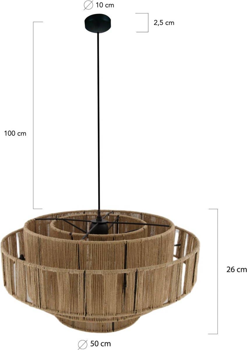 Afmetingen: Lengte: 50 cm Breedte: 50 cm Hoogte: 26 cm Maak je interieur compleet met deze prachtige hanglamp gemaakt van jute. Een jute hanglamp is de perfecte aanvulling op elke interieurstijl. Of je nu een modern, bohemian of landelijk interieur hebt, de natuurlijke uitstraling van een hanglamp van jute voegt warmte en sfeer toe aan elke kamer. De hanglamp is een ware eye catcher door het natuurlijke design waardoor ieder item een unieke uitstraling heeft. Door de open kap geven de lichtstralen een mooi effect op de muur. Hang hem boven je eettafel voor een warm en gezellig diner, of in de hoek van een kamer voor een subtiele sfeerverlichting.