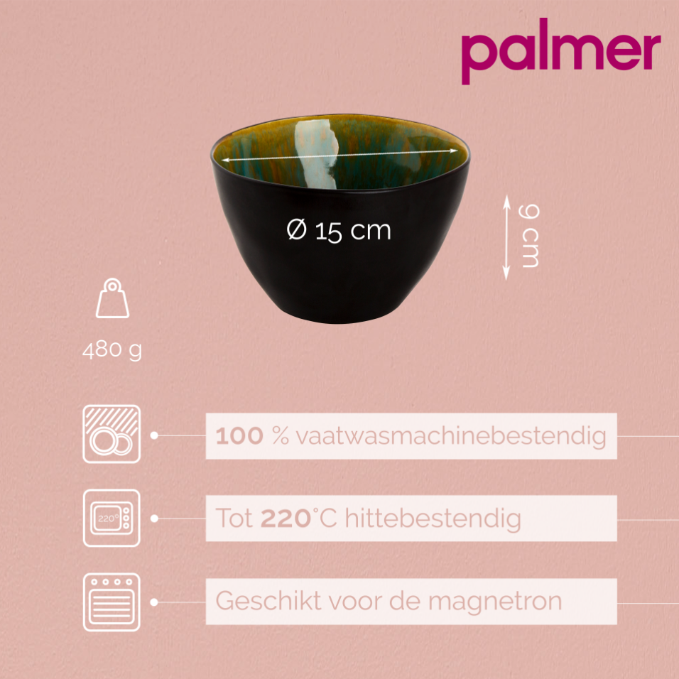 Let op: Ieder item is uniek. Door het bijzondere productieproces "Reactive Glaze", waarbij het item 2 keer de oven in gaat, kan de kleur en/of het patroon per artikel iets afwijken. Belangrijkste kenmerken: · Product: 4 schalen · Diameter: 15 cm · Inhoudsmaat: 1 liter · Materiaal: Stoneware · Kleur: Turquoise met een matzwarte buitenzijde · Vaatwasmachinebestendig: Ja · Hittebestendig: Ja, tot 220°C · Vriezerbestendig: Nee Stoneware Stoneware is een type porselein gemaakt van klei met een fijne korrel gebakken op 1000 á 1100°C. Door dit materiaal op een hoge temperatuur te bakken is het sterker dan doorsnee aardewerk en daardoor zeer geschikt voor dagelijks gebruik. Daarnaast kan stoneware in de oven, de magnetron en de vaatwasser. Dit materiaal is kleur- en geurbestendig. De robuuste uitstraling maakt dat stoneware servies enorm populair is.
