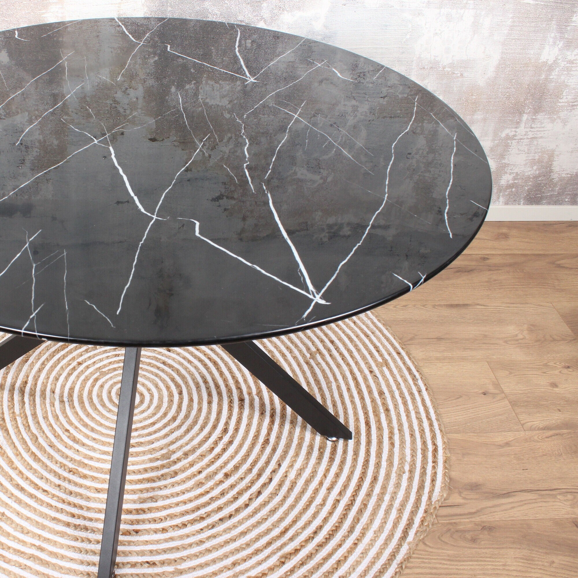 Let op, het blad van deze tafel kan wazen bevatten. Deze wazen zijn er niet uit te poetsen. Ronde tafels zijn onverminderd populair. Deze ronde eettafel Gino komt uit de collectie van ons eigen interieurmerk DS4U. Het ronde tafelblad met een ø van 120 cm, wat geschikt is voor heerlijk tafelen met 4 à 5 personen. Het tafelblad heeft een dikte van 25 mm en het glazen blad is afgewerkt met een stijlvolle, zwart marmer look. Hugo is ook verkrijgbaar in wit marmerlook, zwart mdf of eiken mdf.