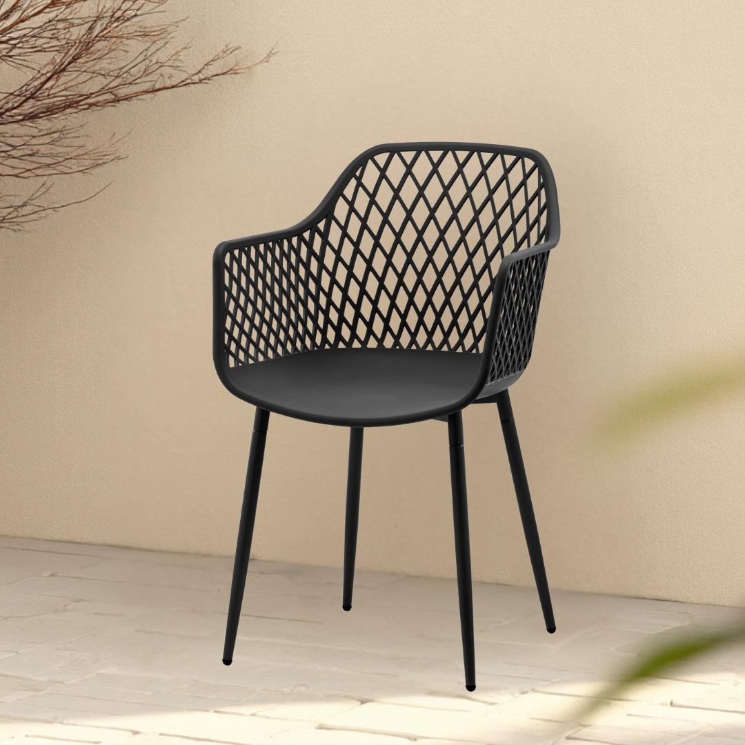 De Niall terrasstoel is een trendy en comfortabele kuipstoel, perfect voor buitengebruik. Deze stoel is gemaakt van stevig kunststof, waardoor hij duurzaam en onderhoudsvriendelijk is. De rugleuning heeft een opvallend design met gaatjes, wat niet alleen zorgt voor een speels effect, maar ook voor extra ventilatie op warme dagen. De Niall terrasstoel is verkrijgbaar in vier kleuren – beige, terracotta, groen en zwart – en voegt met zijn moderne uitstraling een stijlvol accent toe aan elke tuin of terras.
