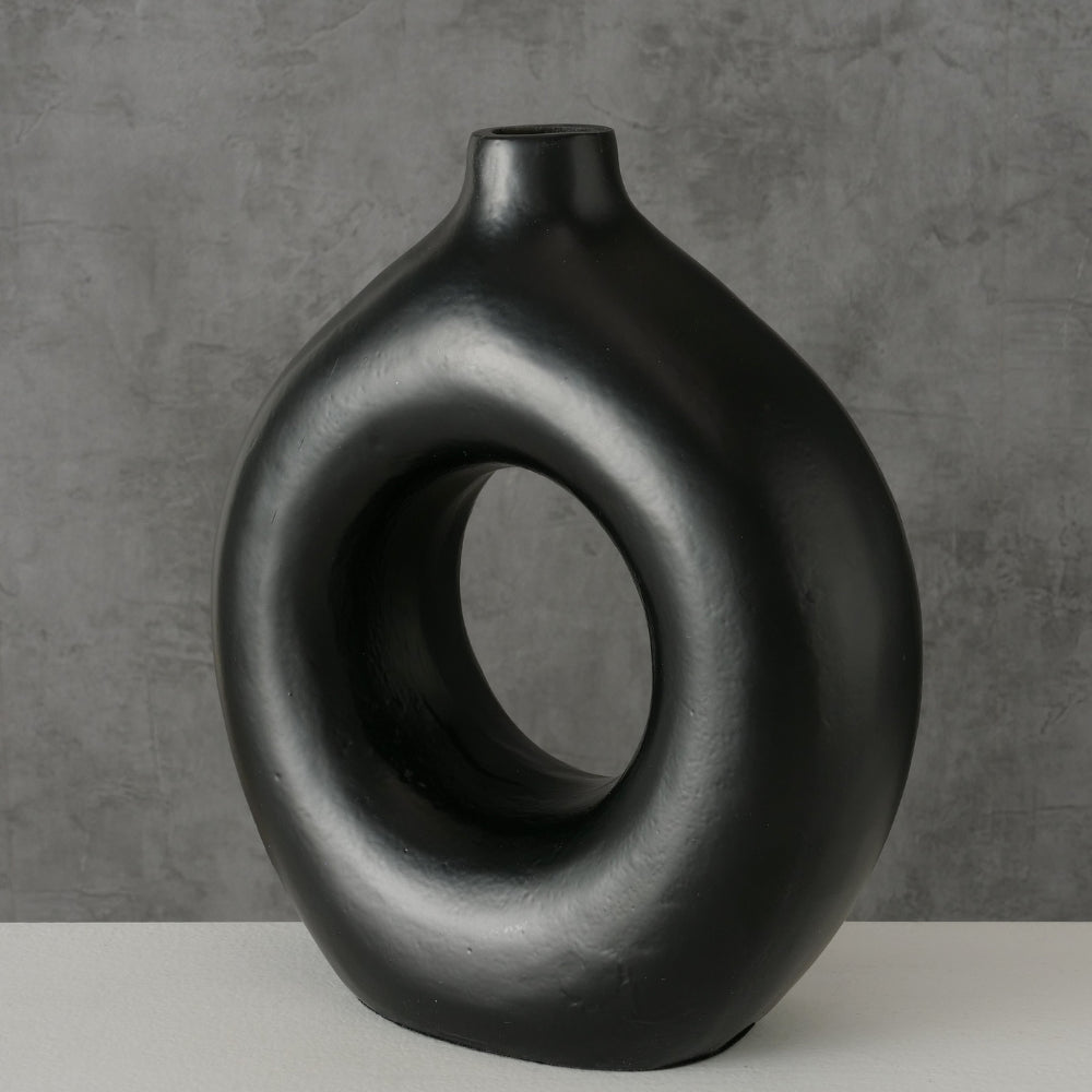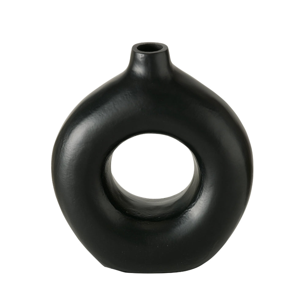 Een unieke ''donut'' vaas die volledig is gemaakt van aluminium. Hij heeft een zwarte laklaag als afwerking en weegt 1.1 kilogram. De vaas is handgemaakt, wat betekent dat het aluminium is gegoten door vakbekwame handwerklieden tot zijn uiteindelijke vorm. Door zijn speciale ringvormige design past hij perfect in een modern interieur. Tot slot is zijn onderkant afgewerkt met een zachte suède stof. Zijn hoogte is 23 centimeter. Unieke productkenmerken