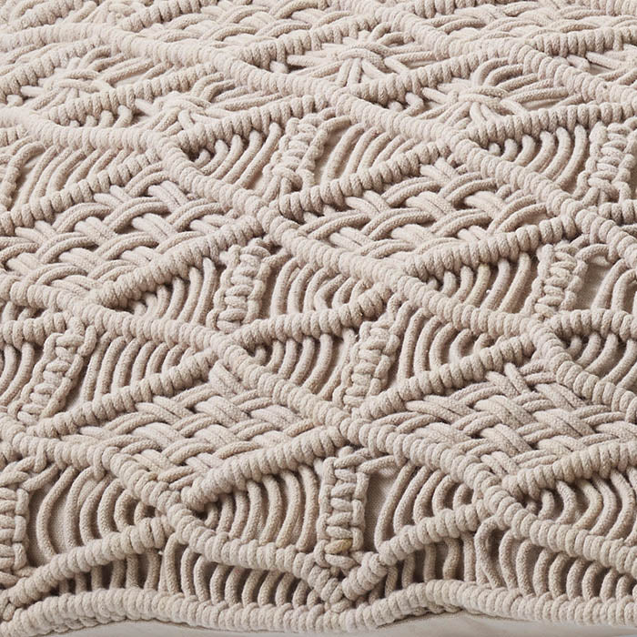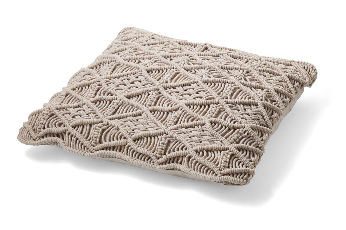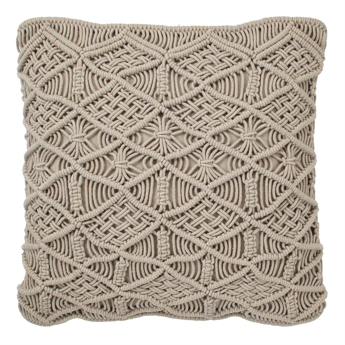 - Het kussen heeft op de voorkant een geknoopt motief van een wat stugger materiaal