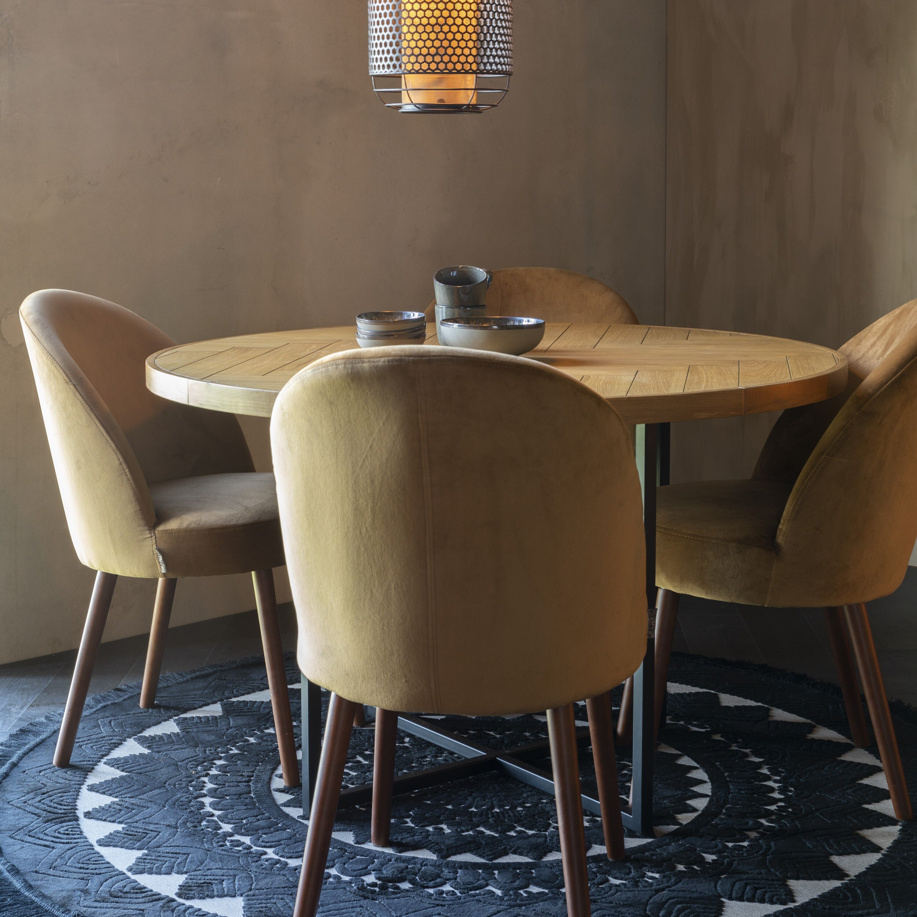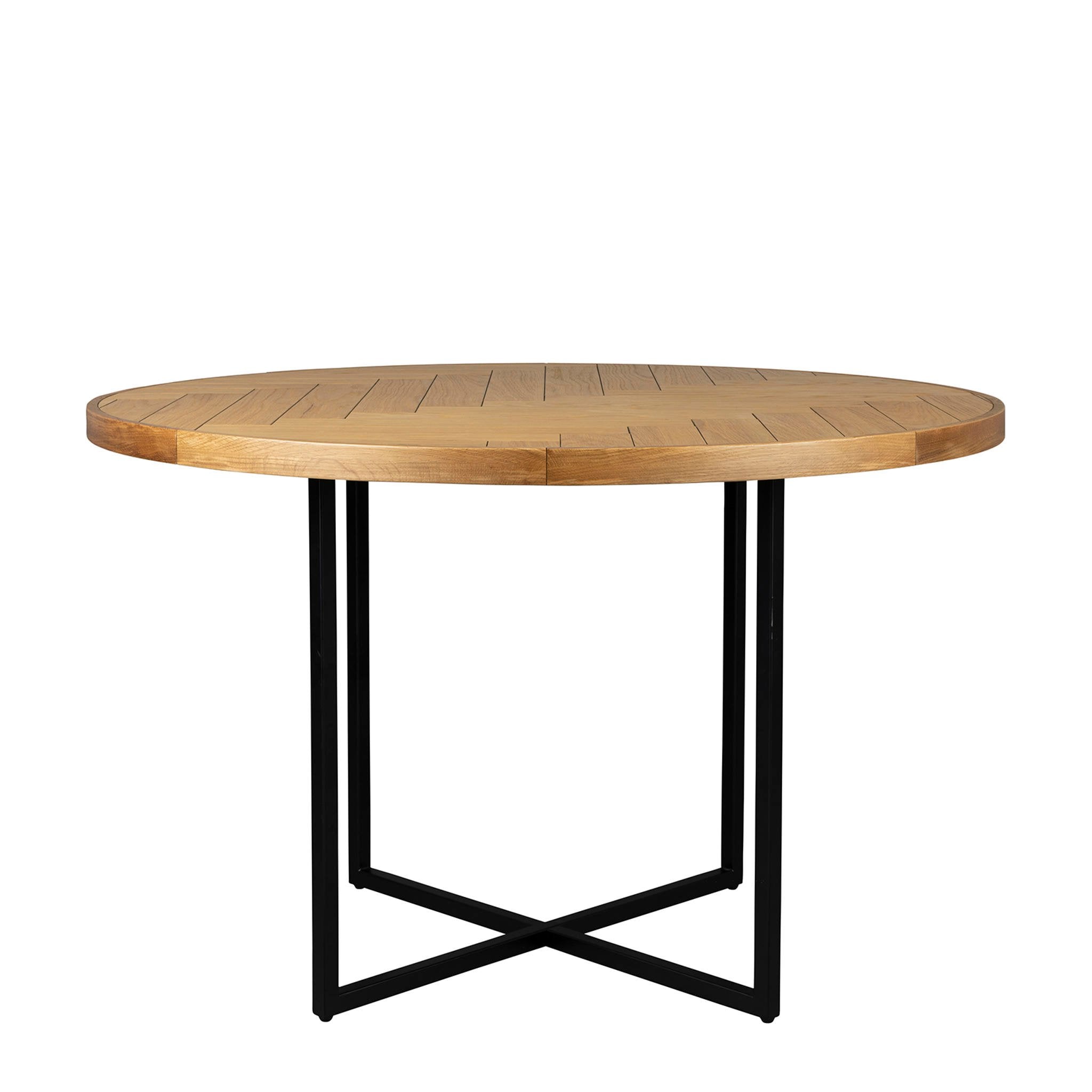 - Mooie ronde tafel met visgraat ingelegd tafelblad.