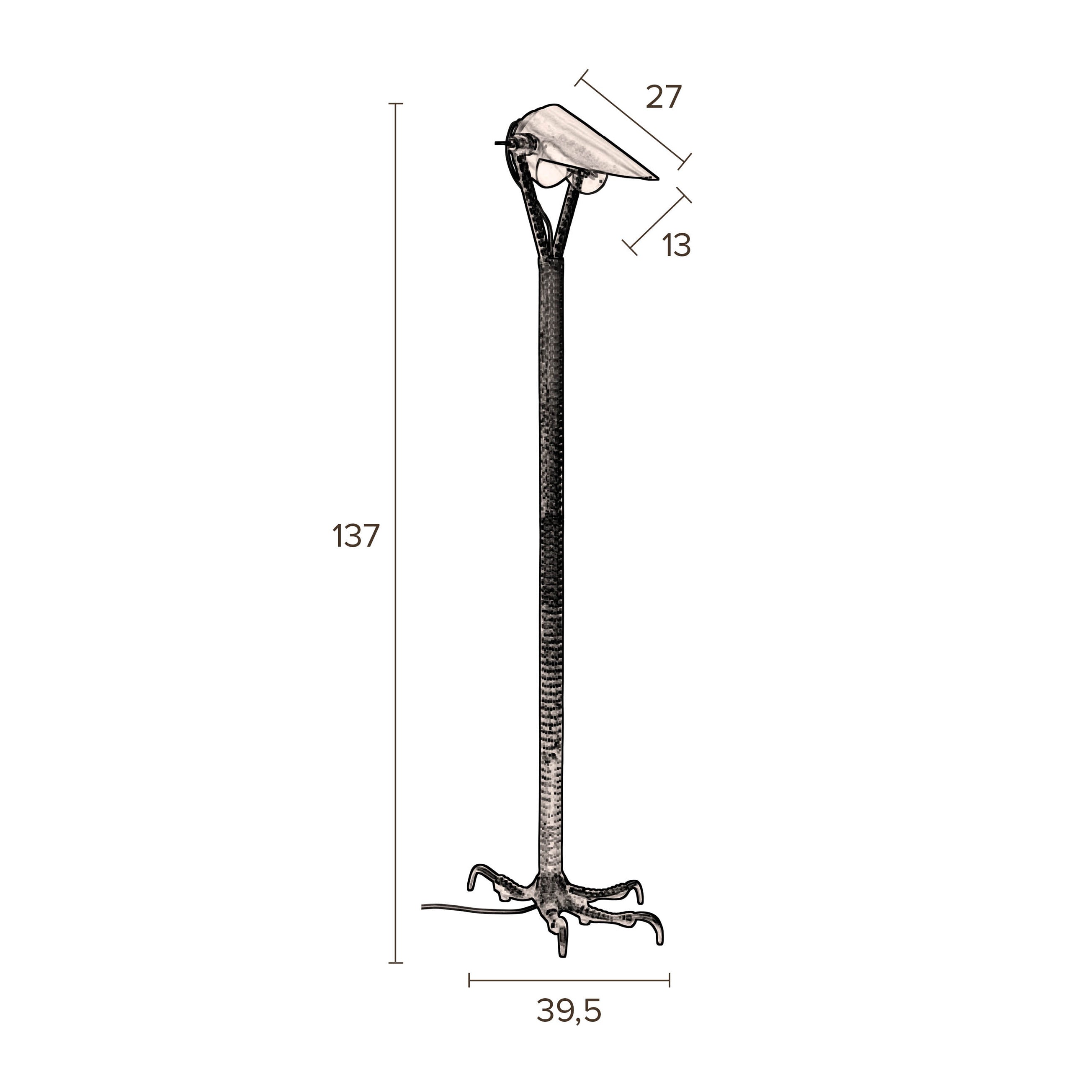 Eigenschappen van de Falcon Deze toffe vloerlamp is gemaakt van gepoedercoat ijzer en heeft een aluminium body en voet. De kabel is gemaakt van textiel en het snoer is vanaf de voet 1,6 m lang. De kap is verstelbaar en de fitting die geschikt is voor een E27 lichtbron van max 25W.