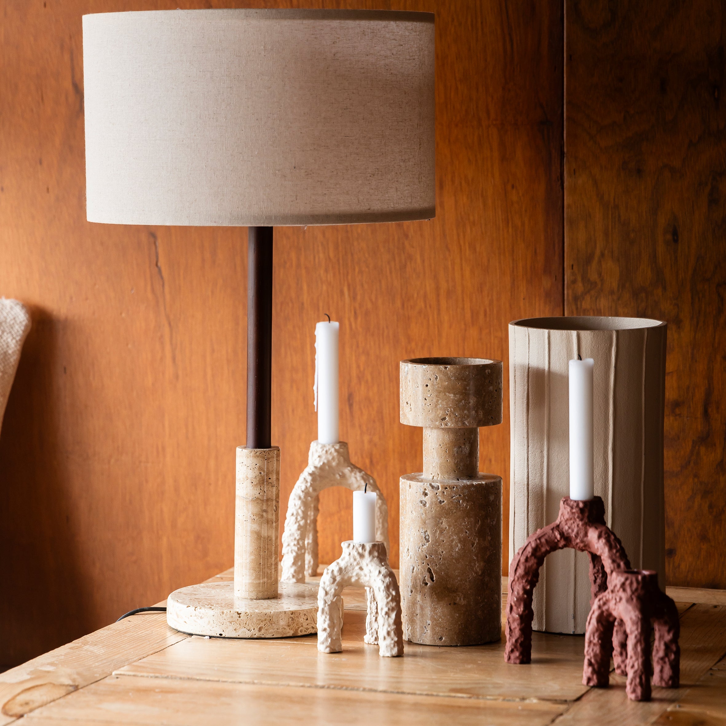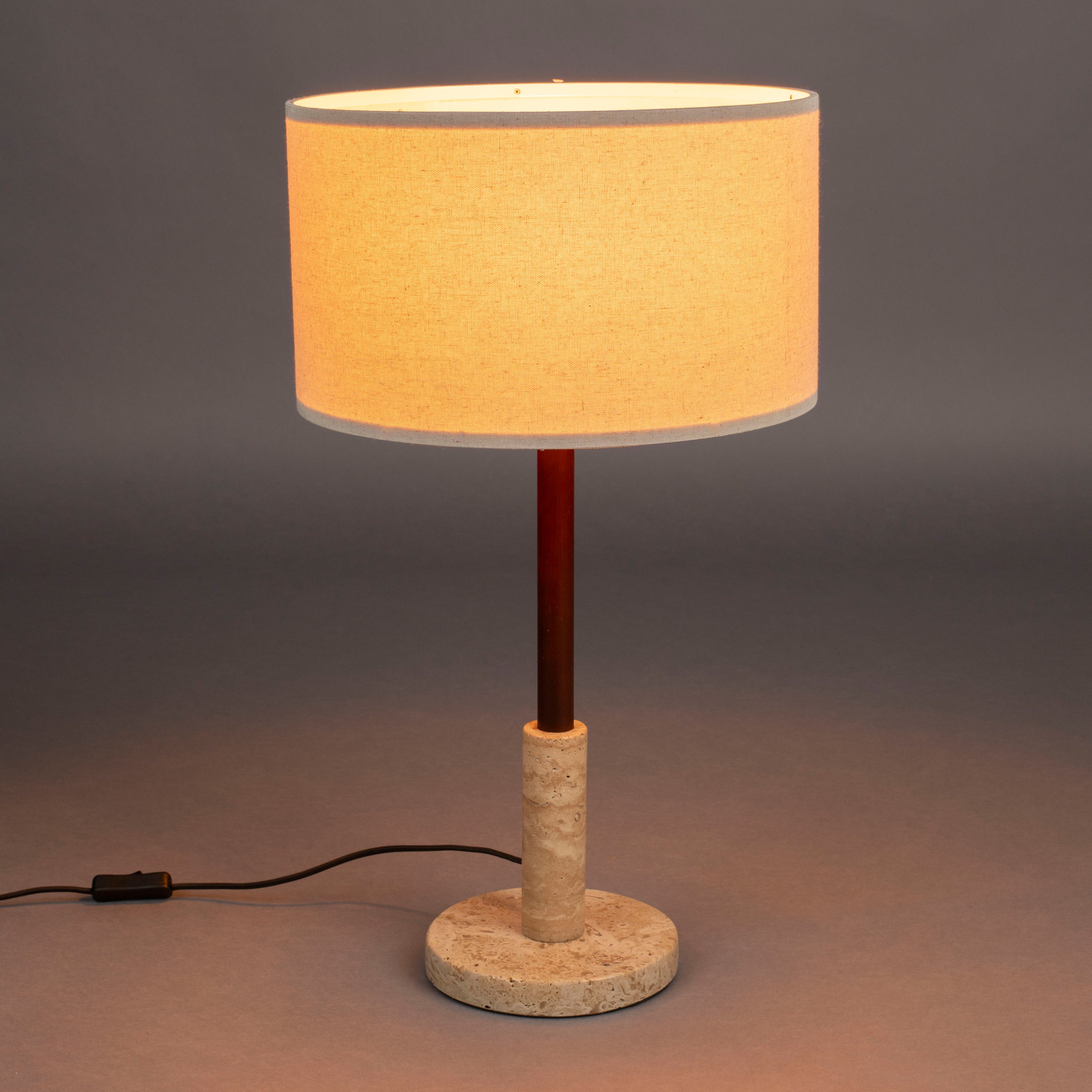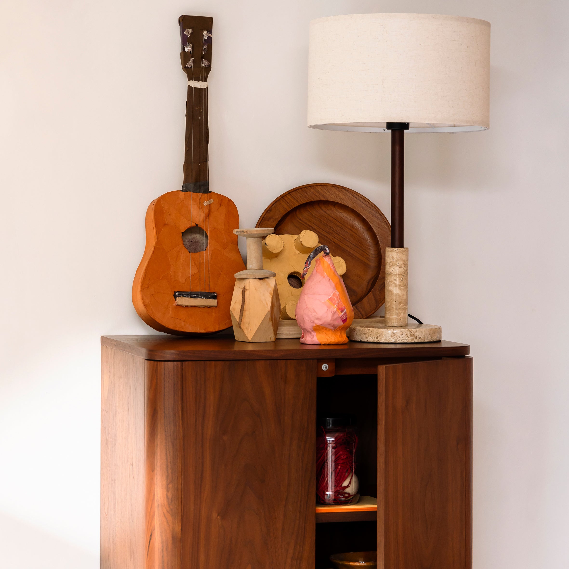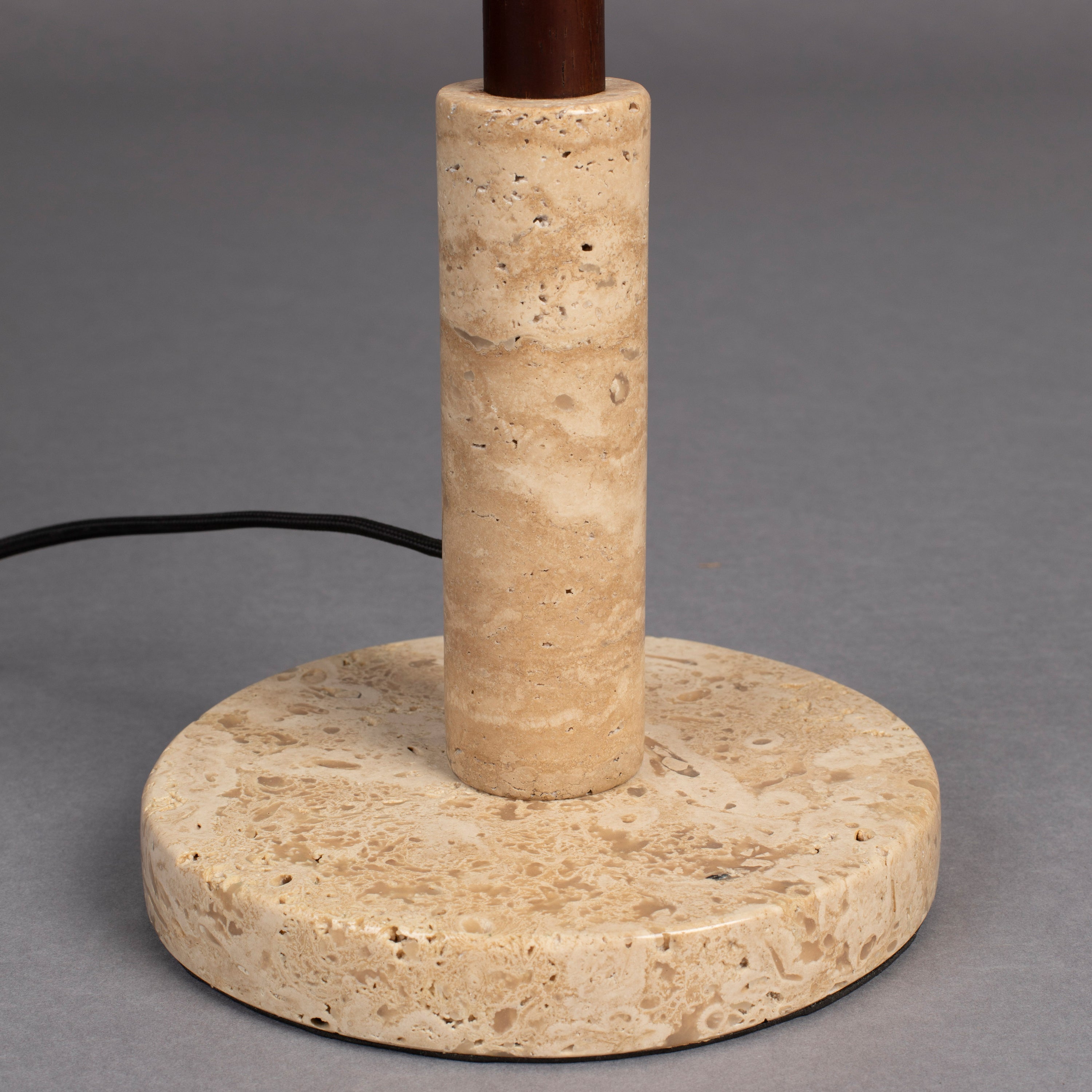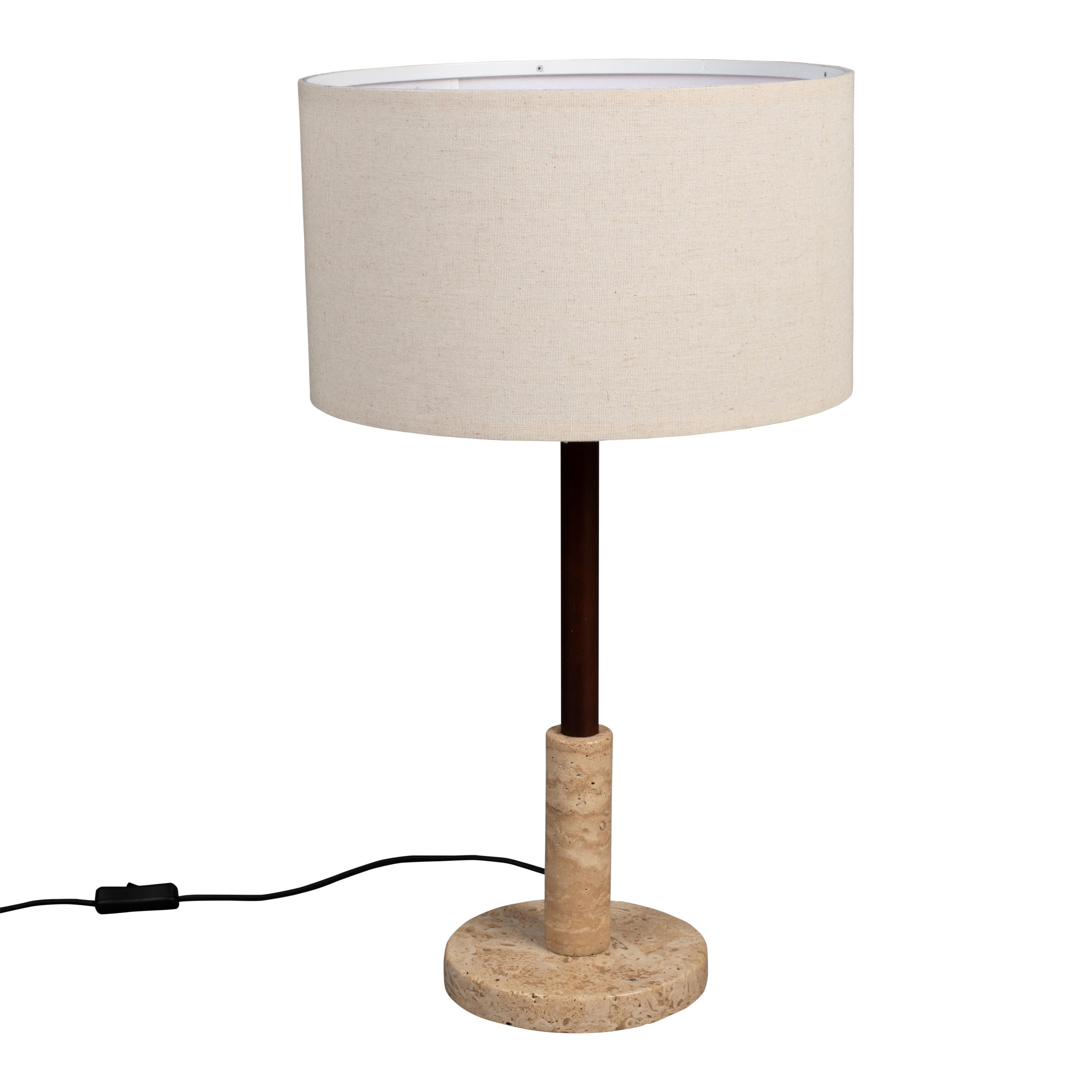 - De voet is gemaakt van stevig kalksteen en walnootkleurig hout