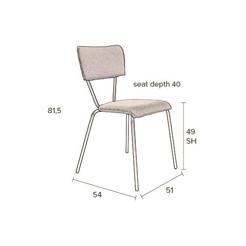De hoogte van de zitting, gemeten vanaf de vloer. De ideale zithoogte bevindt zich tussen de 40 en 46 cm. Je zit het lekkerst met een ruimte van ongeveer 20 cm, tussen de stoelzitting en de onderkant van het tafelblad.