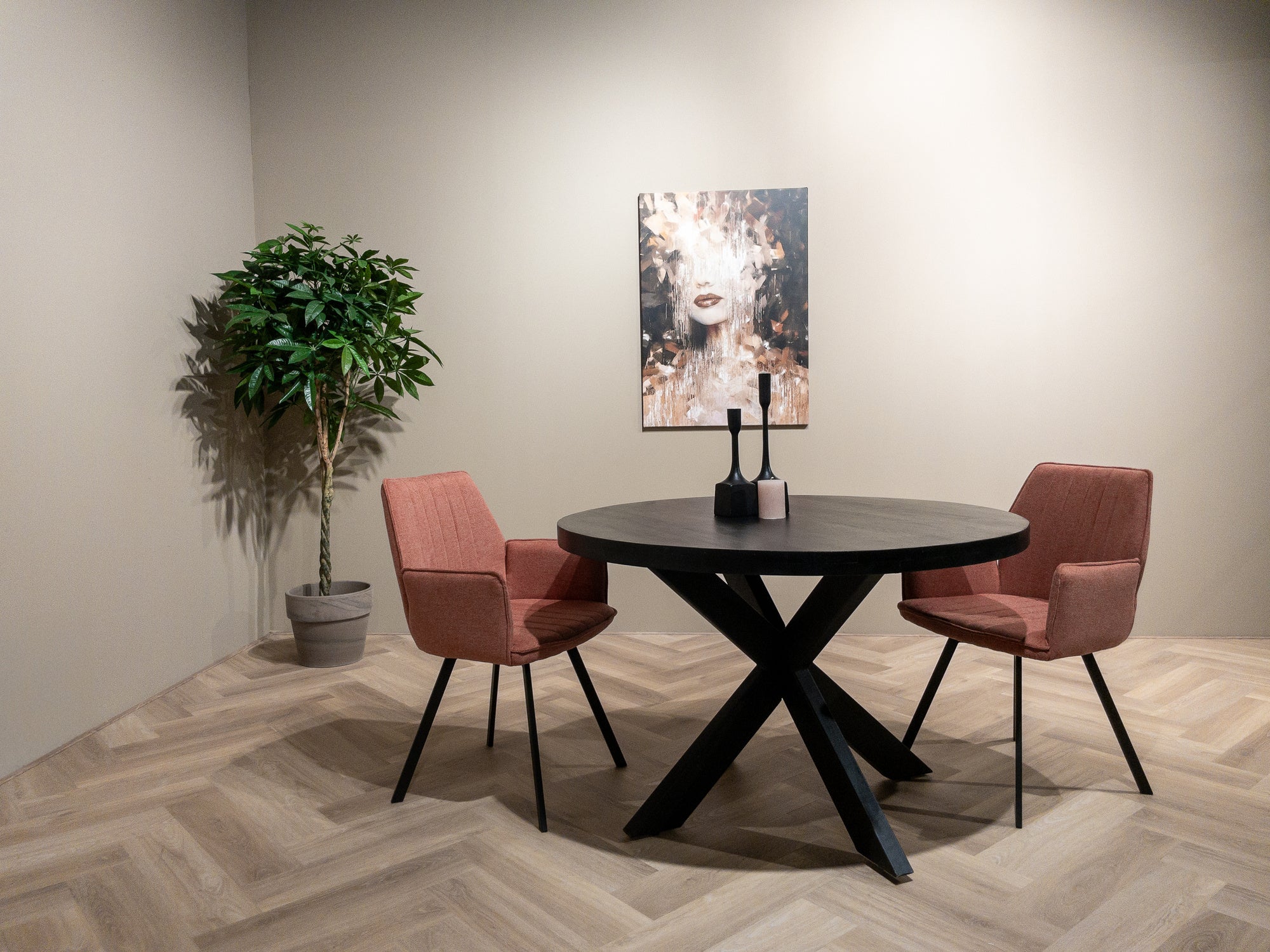 De Black Omerta eettafel is vervaardigd uit mangohout met een diameter van 120 cm, ondersteund door een zwart gecoat stalen spider poot. Het mangohout is zorgvuldig afgewerkt met een beschermende zwarte finish. Deze stijlvolle afwerking geeft deze collectie karakter en maakt het een echte eyecatcher in je interieur. Duurzaam materiaal