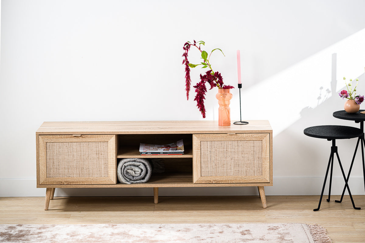 Cosy Scandinavian - TV-meubel - 2 deuren - 2 nissen - MDF met melamine - linnen structuur deco De Cosy Scandinavian lijn meubels zijn vervaardigd uit MDF en afgewerkt met een robuuste melamine, het geheel straalt een zeer aangename huiselijke sfeer uit dankzij de fronten met een linnen structuur Te monteren meubel met duidelijke handleiding