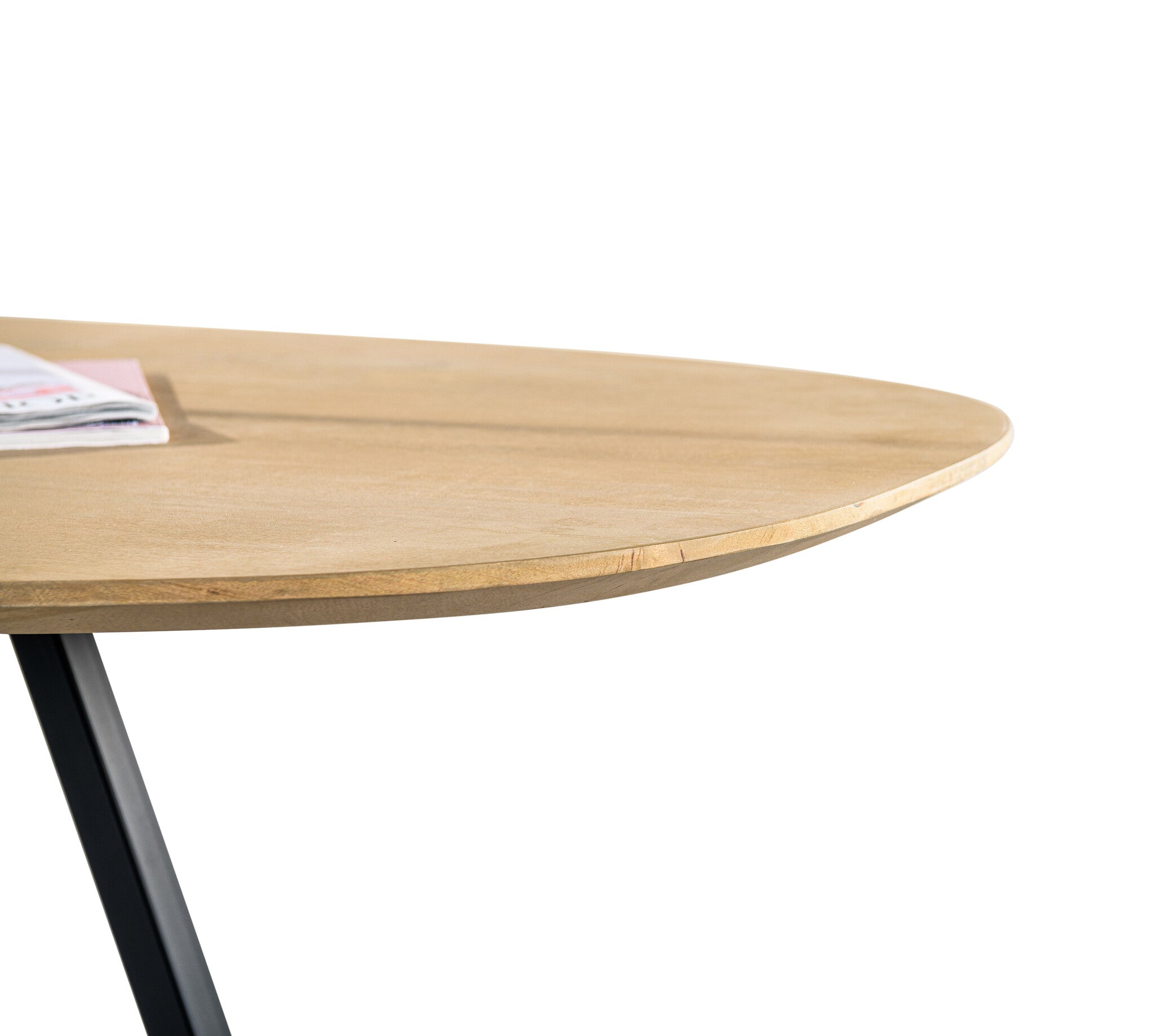 Nordic design eettafel met ovaal verjongd blad in massieve naturel acacia, ondersteund door een zwart stalen vlinderpoot