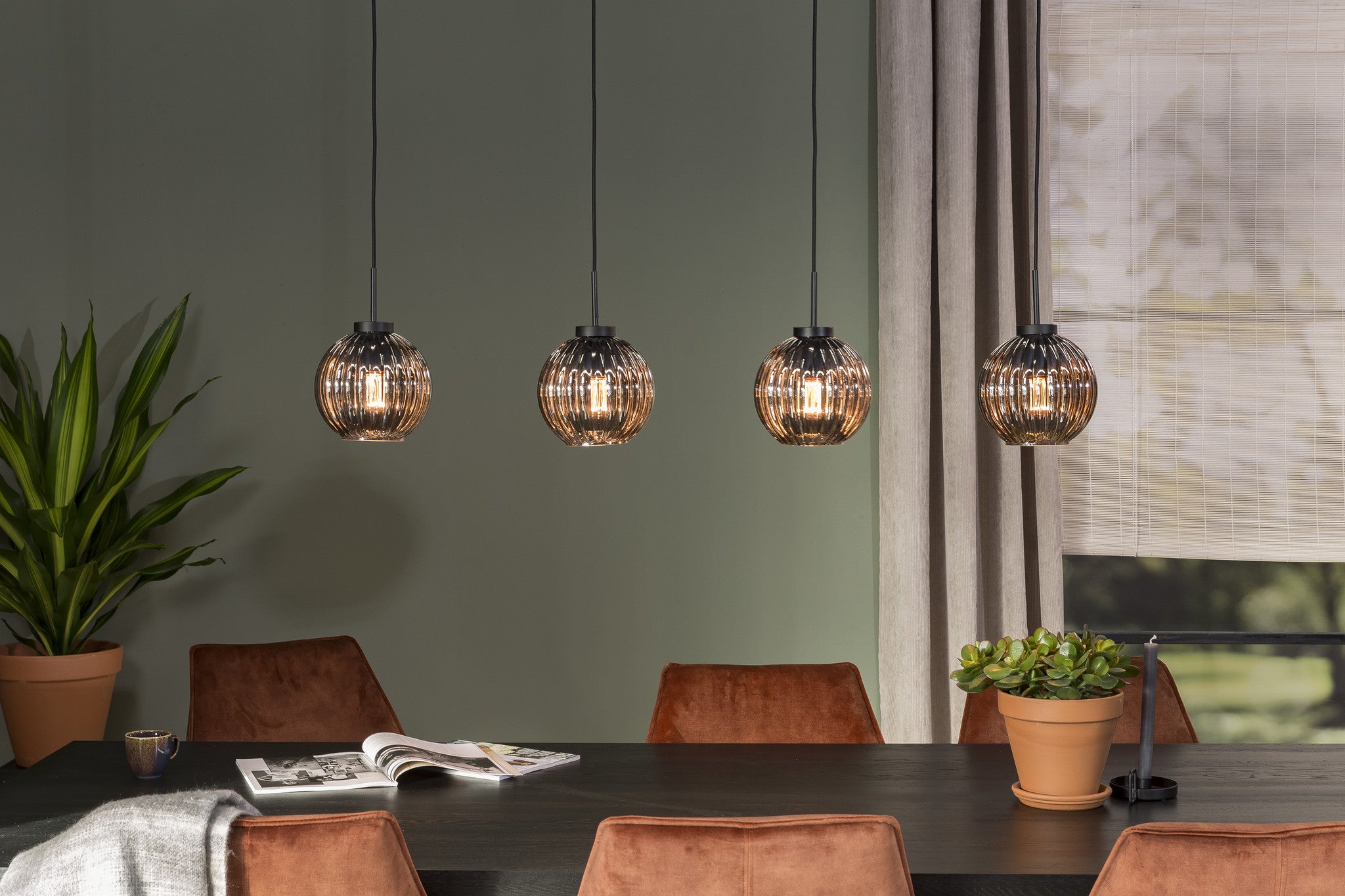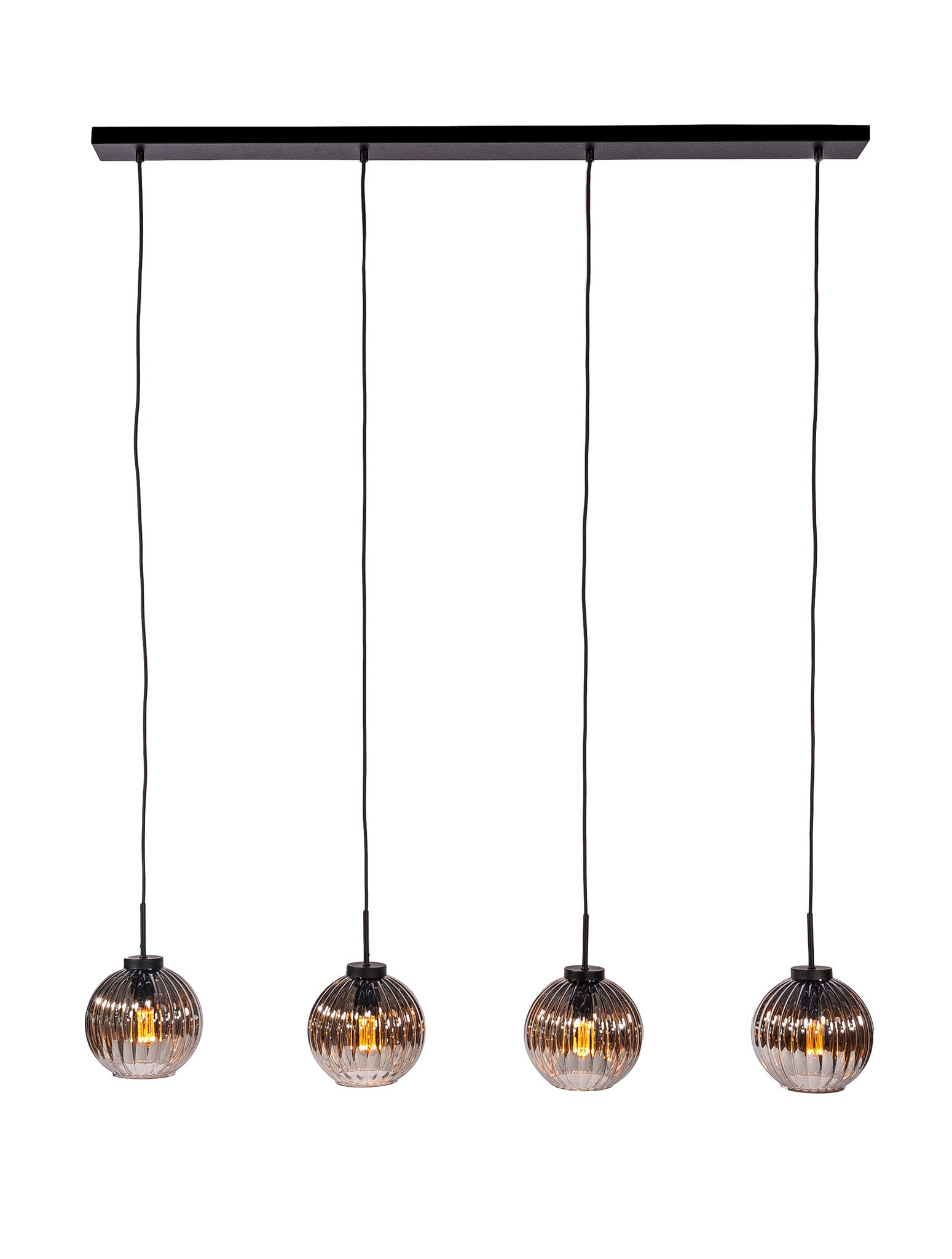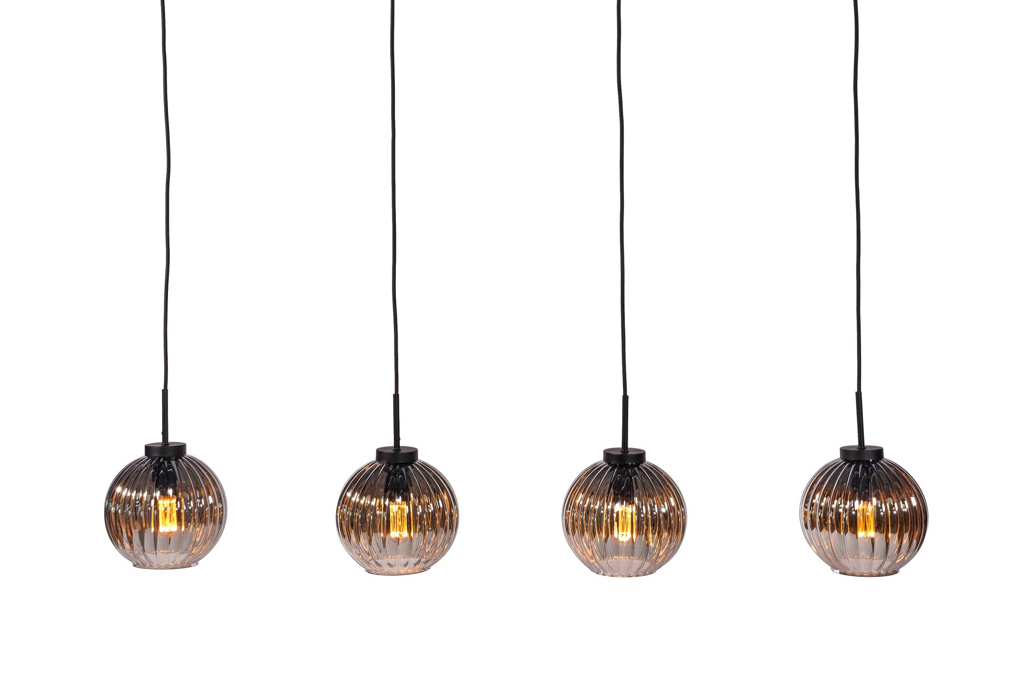 Deze vintage hanglamp is een echte eyecatcher in je interieur. Het gerookte glas is geribbeld en heeft een bolvormige vorm. Met de 4 lichtpunten op 1 lijn geeft de lamp een stijlvolle uitstraling. De lamp is een echte sfeermaker in je interieur. Geschikt voor verschillende stijlen