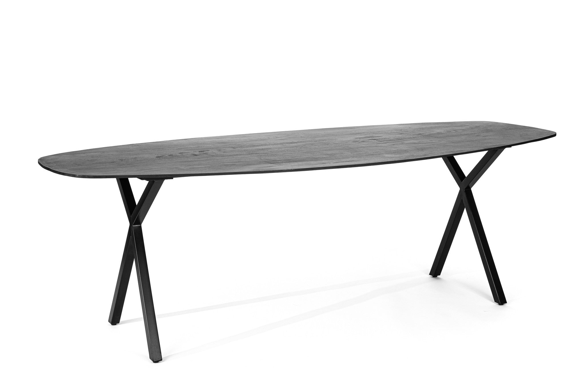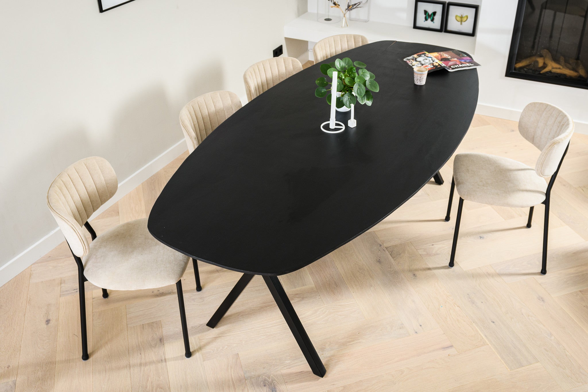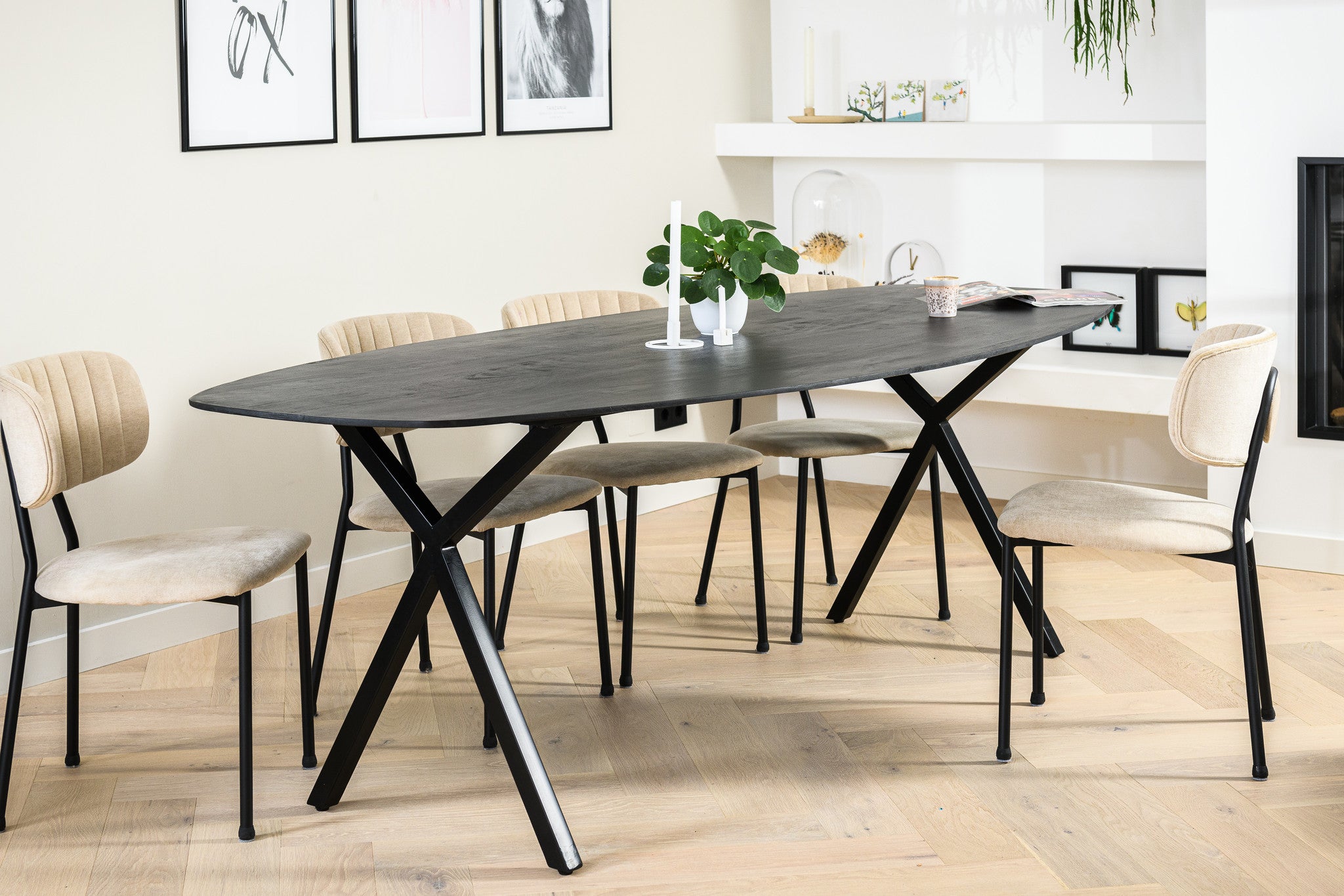 Deze stijlvolle eettafel is vervaardigd uit zwart gecoat mangohout en wordt ondersteund door een zwarte stalen kruispoot. De ovaalvormige tafel heeft een afmeting van 240cm x 110cm en is daarmee geschikt voor een groot gezelschap. De tafel is een echte eyecatcher in je eetkamer en past perfect bij de andere meubels uit deze collectie. Kwaliteit en duurzaamheid