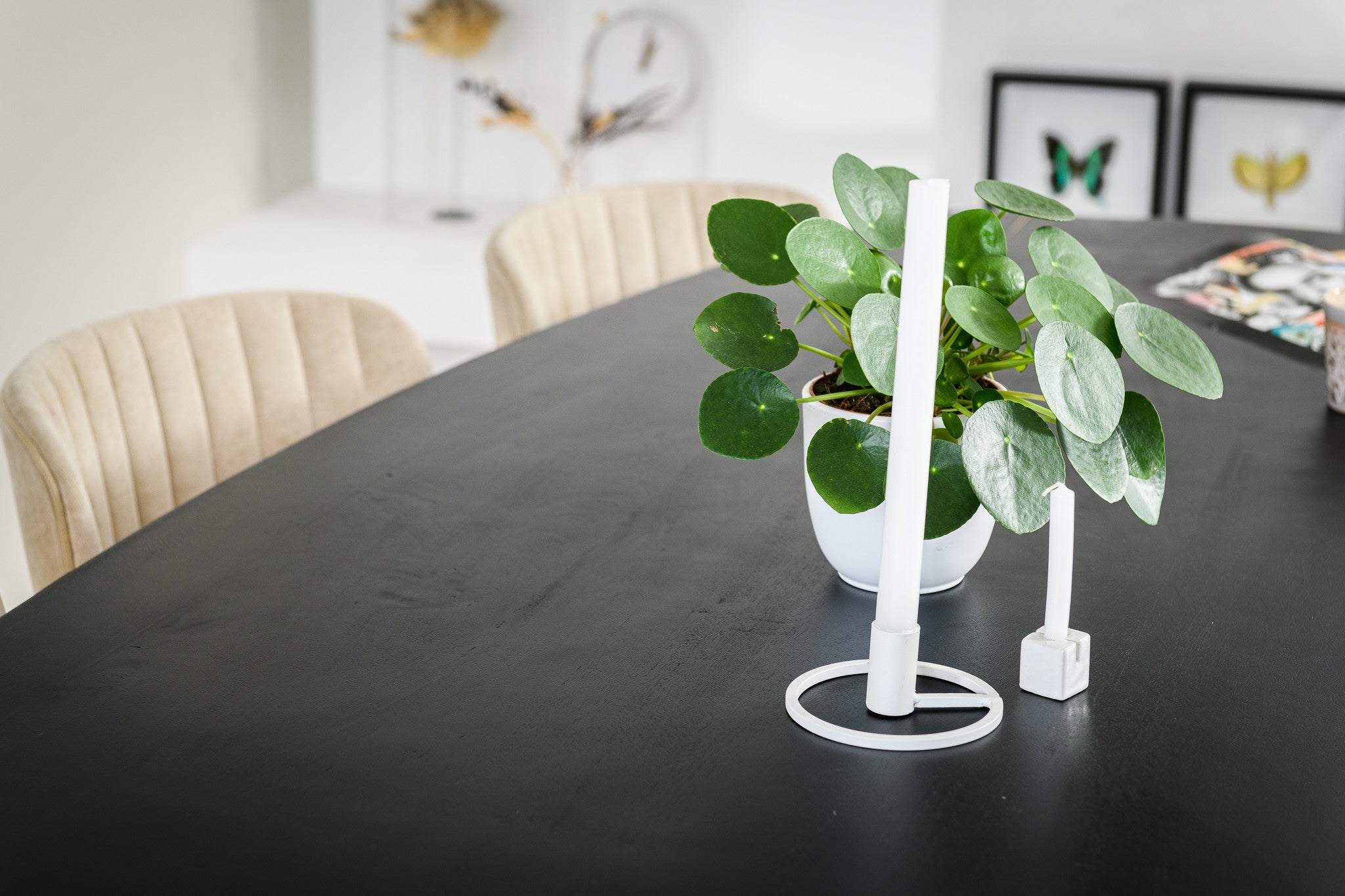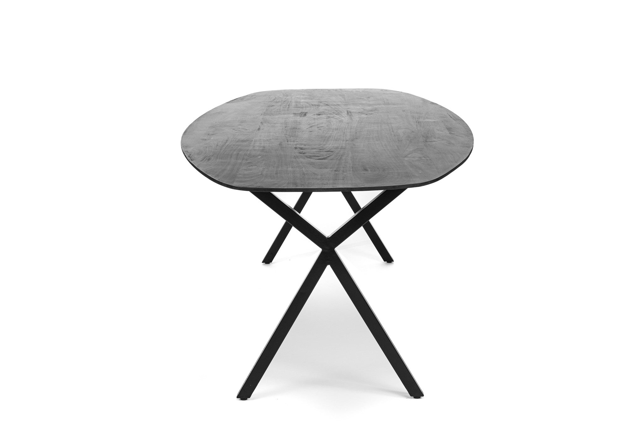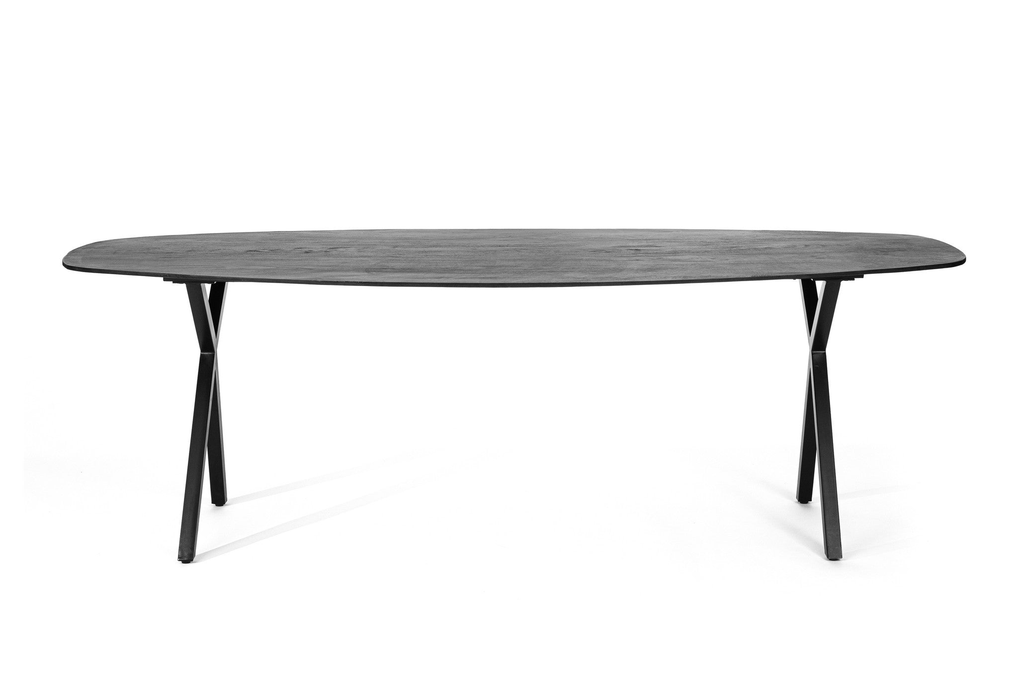 Deze stijlvolle eettafel is vervaardigd uit zwart gecoat mangohout en wordt ondersteund door een zwarte stalen kruispoot. De ovaalvormige tafel heeft een afmeting van 240cm x 110cm en is daarmee geschikt voor een groot gezelschap. De tafel is een echte eyecatcher in je eetkamer en past perfect bij de andere meubels uit deze collectie. Kwaliteit en duurzaamheid