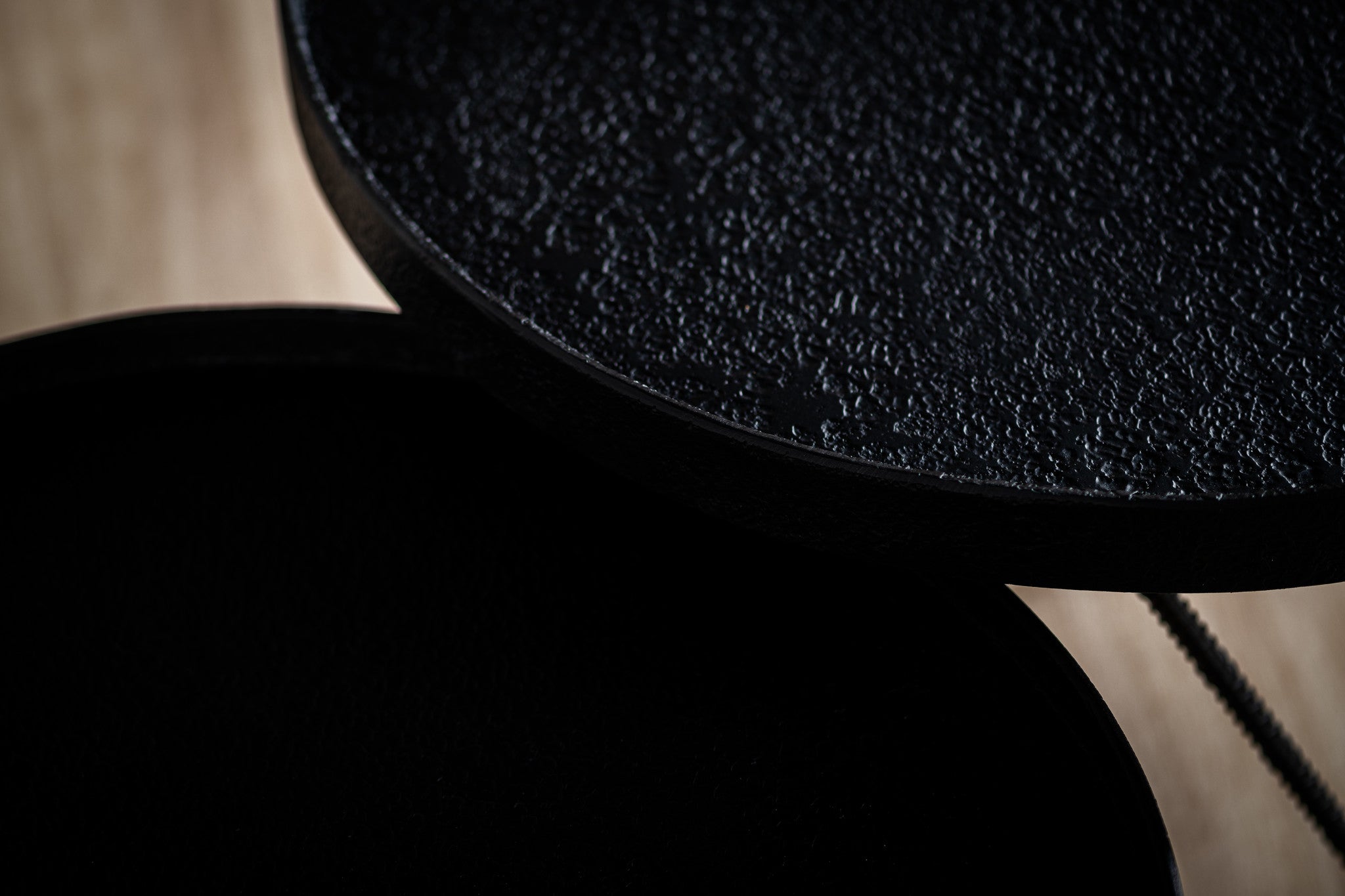 Volcano - Salontafels - set van 2 - rond met rand - lava metaal - zwart - V-poten De Volcano reeks meubels zijn vervaardigd uit gesmolten lava metaal op teak en ondersteund door stalen poten. Elk exemplaar is uniek, bijna onverwoestbaar en weerbestendig. Straalt een stoere look uit die je interieur een klassevolle uitstraling geeft B54xD54xH40 cm B54xD54xH35 cm