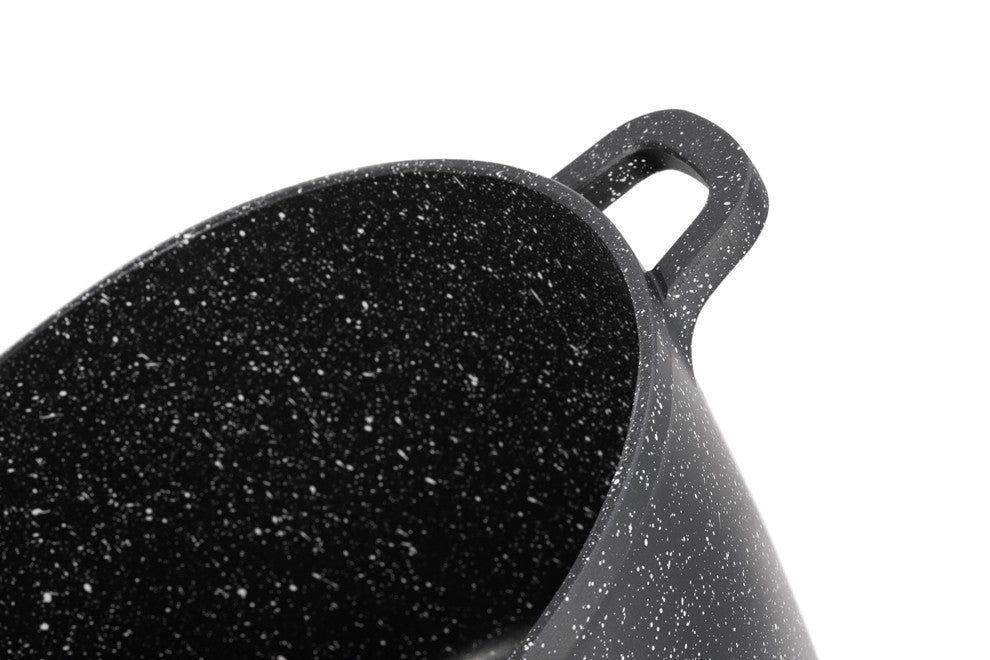 - Gegoten aluminium, met marmeren coating, ideaal tegen aanbranden en voor vetarm koken