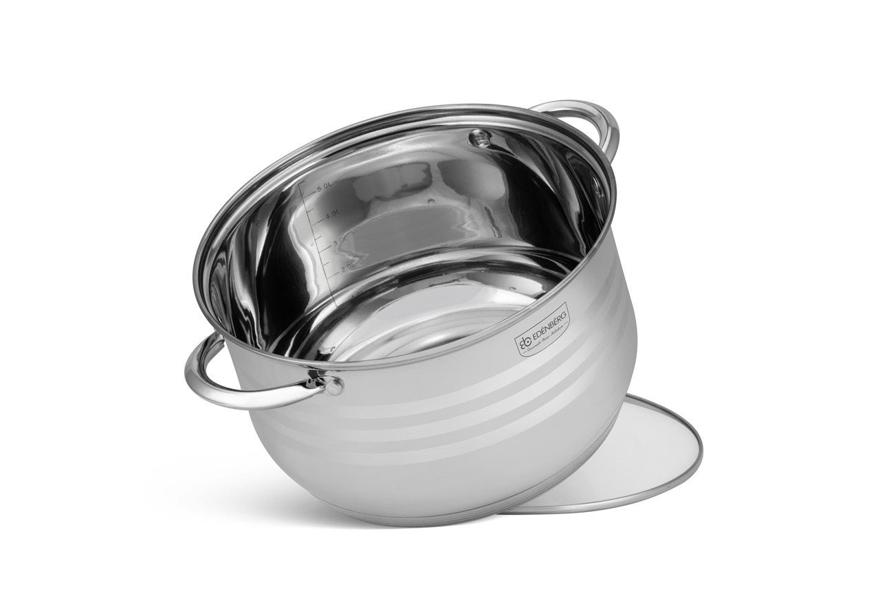 Prachtige 12-delige pannenset van hoge kwaliteit. Een set gemaakt van hoogwaardig roestvrij staal. Product gerenommeerde merk Edënbërg . Dankzij de speciale bodem wordt de warmte snel verdeeld, waardoor je energie bespaart. In de pan zit een praktische maataanduiding voor gebruiksgemak. Praktische profiel van de rand van de pannen om morsen van vloeistoffen tijdens het koken te voorkomen. De pannen hebben geklonken handvatten. U kunt de pannenset veilig gebruiken in een afwasmachine. De pannen zijn geschikt voor alle warmtebronnen: elektrisch, gas, keramisch, halogeen en inductie. De uitgebreide set is ideaal voor de starter maar ook voor de ervaren kok ter vervanging of aanvulling van de huidige pannen. Of je nou een verse saus wilt bereiden of de groenten koken wilt koken, het kan allemaal op een gemakkelijk wijze zonder aankoeken en moeilijk schoonmaken. Belangrijkste kenmerken :