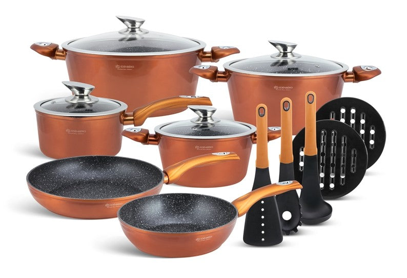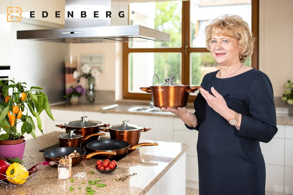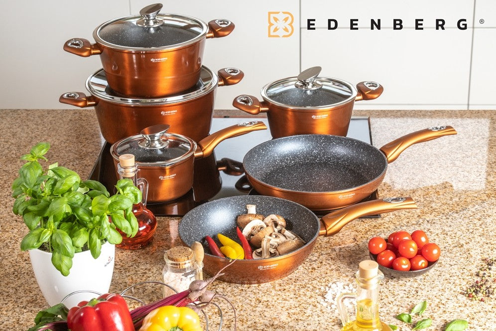 Edënbërg Copper Line -15-delige Luxe Pannenset van Gesmeed Aluminium Deze prachtige pannenset van Edënbërg wordt geproduceerd onder de strengste Duitse normen en met het beste aluminium. De bodem is bedekt met maar liefst 3 lagen marmer met een mooie zwarte binnenkant die niet verkleurd. Dankzij de dikke bodem zijn de pannen zeer duurzaam en wordt het eten gelijkmatig verwarmd. De pannen kunnen worden gebruik op een kookplaat en ook op een fornuis met inductie. De 3 lagen marmer bodem is de beste anti-aanbaklaag die je je kunt wensen. Het materiaal is tot wel 7 x sterker dan een traditionele anti-aanbaklaag en eten kan niet aankoeken. Je kunt daardoor zonder of met een klein beetje olie of boter gezonde maar ook lekkere gerechten op tafel zetten. Darnaast zijn de pannen door de marmeren lagen veel makkelijker met de hand of in de vaatwasser schoon te maken. De marmeren lagen behouden hun klaar, zijn minder kwetsbaar, distribueren warmte perfect en bevatten absoluut GÉÉN gifitige stoffen. Wat wilt de professionele of hobby kok nog meer? De uitgebreide set is ideaal voor de starter maar ook voor de ervaren kok ter vervanging of aanvulling van de huidige pannen. Of je nu voor iedereen een visje wilt grillen op de plaat, een stukje vlees wilt bakken in de pannen, een verse saus bereiden of de groenten koken: het kan allemaal op een gemakkelijk wijze zonder aankoeken en moeilijk schoonmaken. Belangrijkste kenmerken: