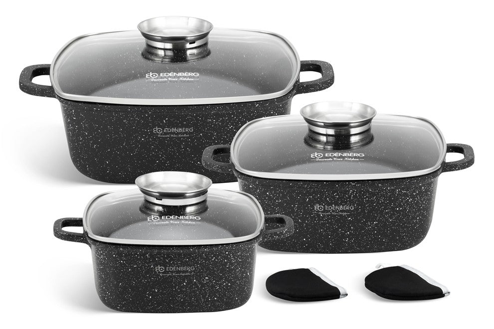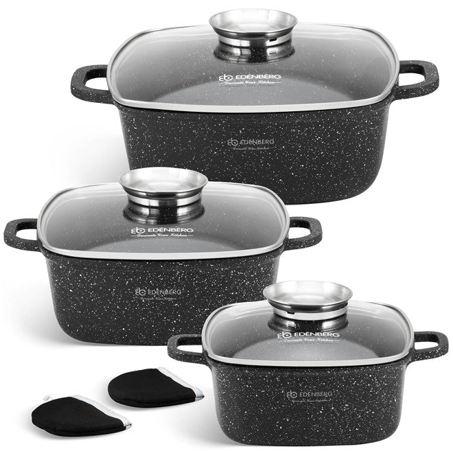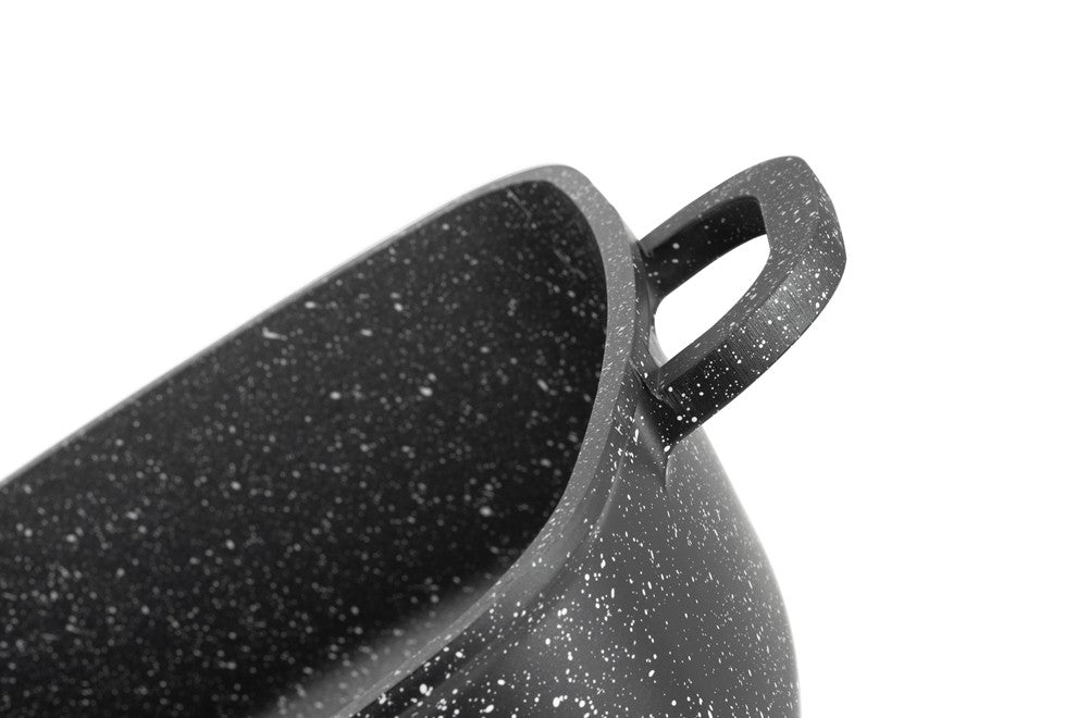 Prachtige 8-delige pannenset van hoge kwaliteit. Een set gemaakt van hoogwaardig gesmeed aluminium en een marmeren coating. Door de marmeren coating bakken je gerechten absoluut niet aan. Tevens is deze pannenset voorzien van een antikleeflaag waardoor het mogelijk is om vetarm te koken. U kunt de pannenset veilig gebruiken in een afwasmachine. De pannen zijn geschikt voor alle warmtebronnen: elektrisch, gas, keramisch, halogeen en inductie. Daarnaast is het ook mogelijk om dit product in de oven te gebruiken ( zonder deksel ) Belangrijkste kenmerken :
