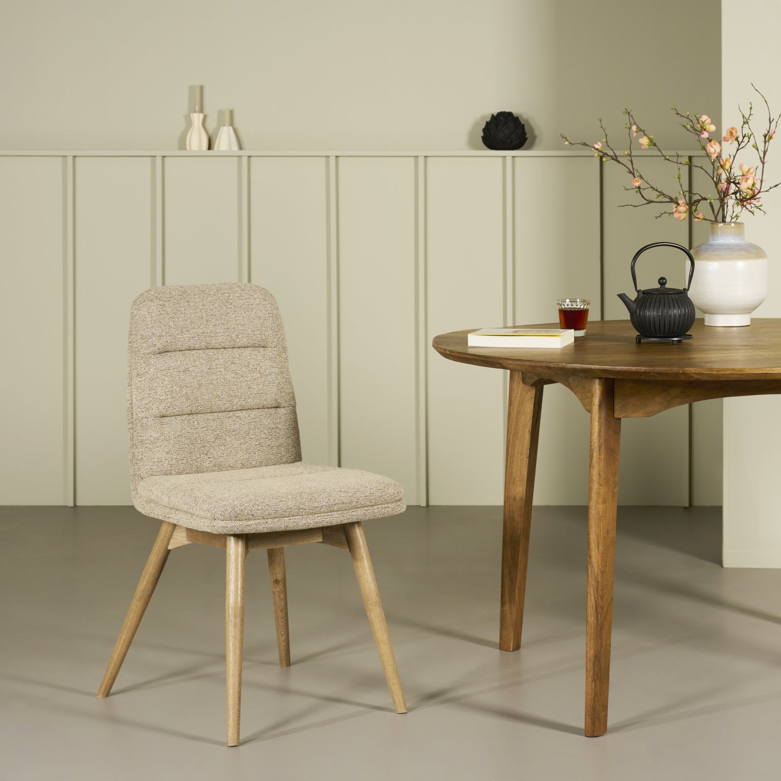 Eetkamerstoel Mora is een echte eyecatcher voor jouw eetkamer. Met zijn zachte, afgeronde vormen en lichte houten poten voegt deze stoel een stijlvolle touch toe aan iedere ruimte. De luxe structuur van de bekleding nodigt uit om plaats te nemen, terwijl de natuurlijke, gemêleerde kleuren moeiteloos harmoniëren met elk interieur. Eetkamerstoel Mora is ideaal voor lange avonden aan de eettafel, waar je kunt genieten van fijne gesprekken en gezellig samenzijn.- afmeting 48x88x63 cm (bxhxd)