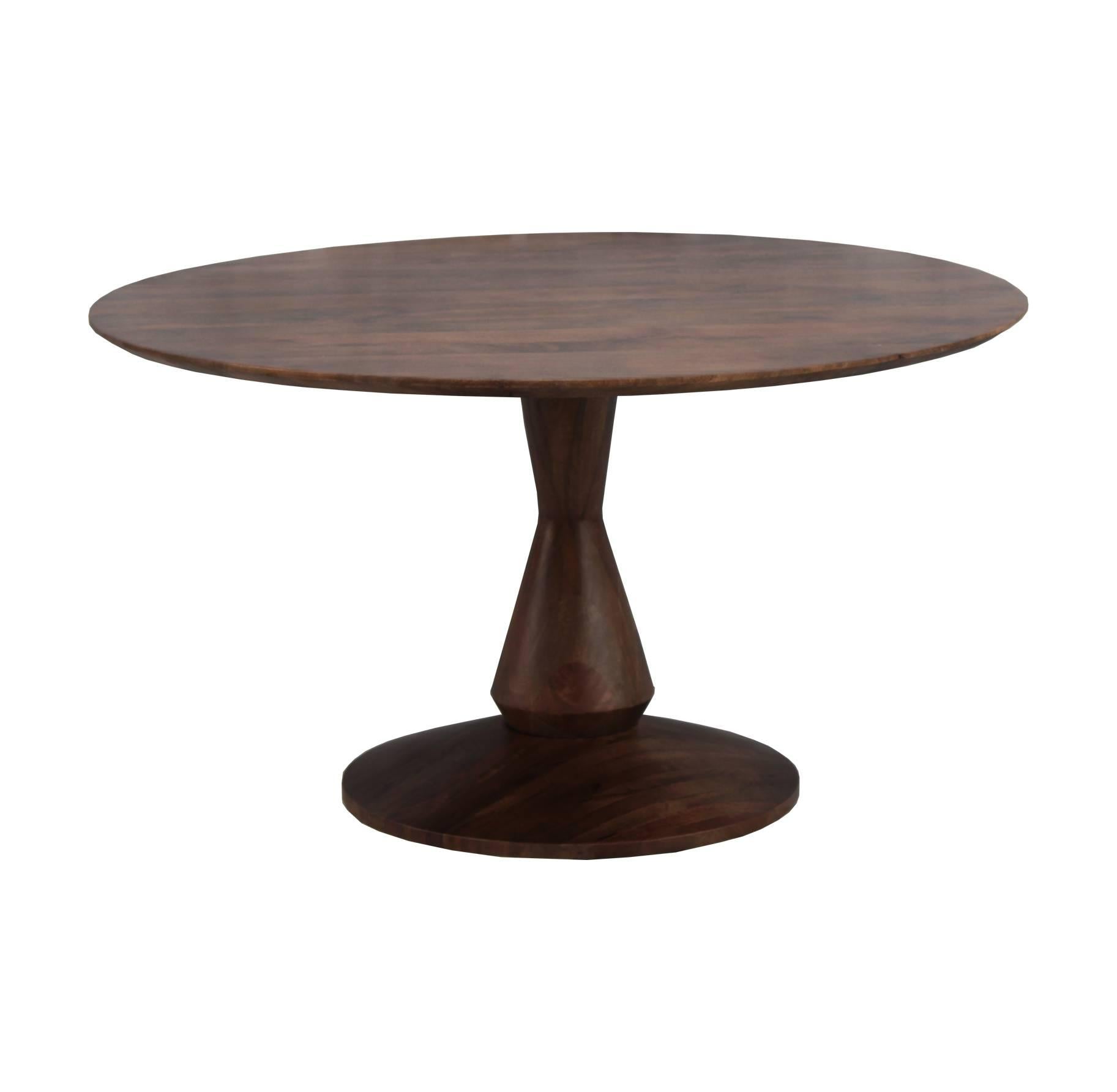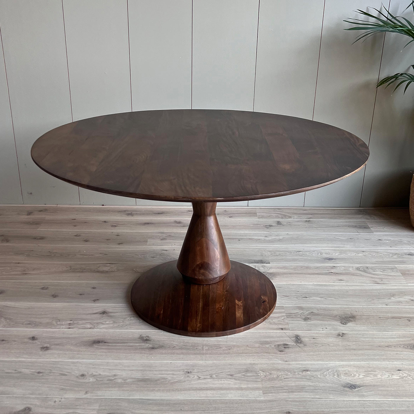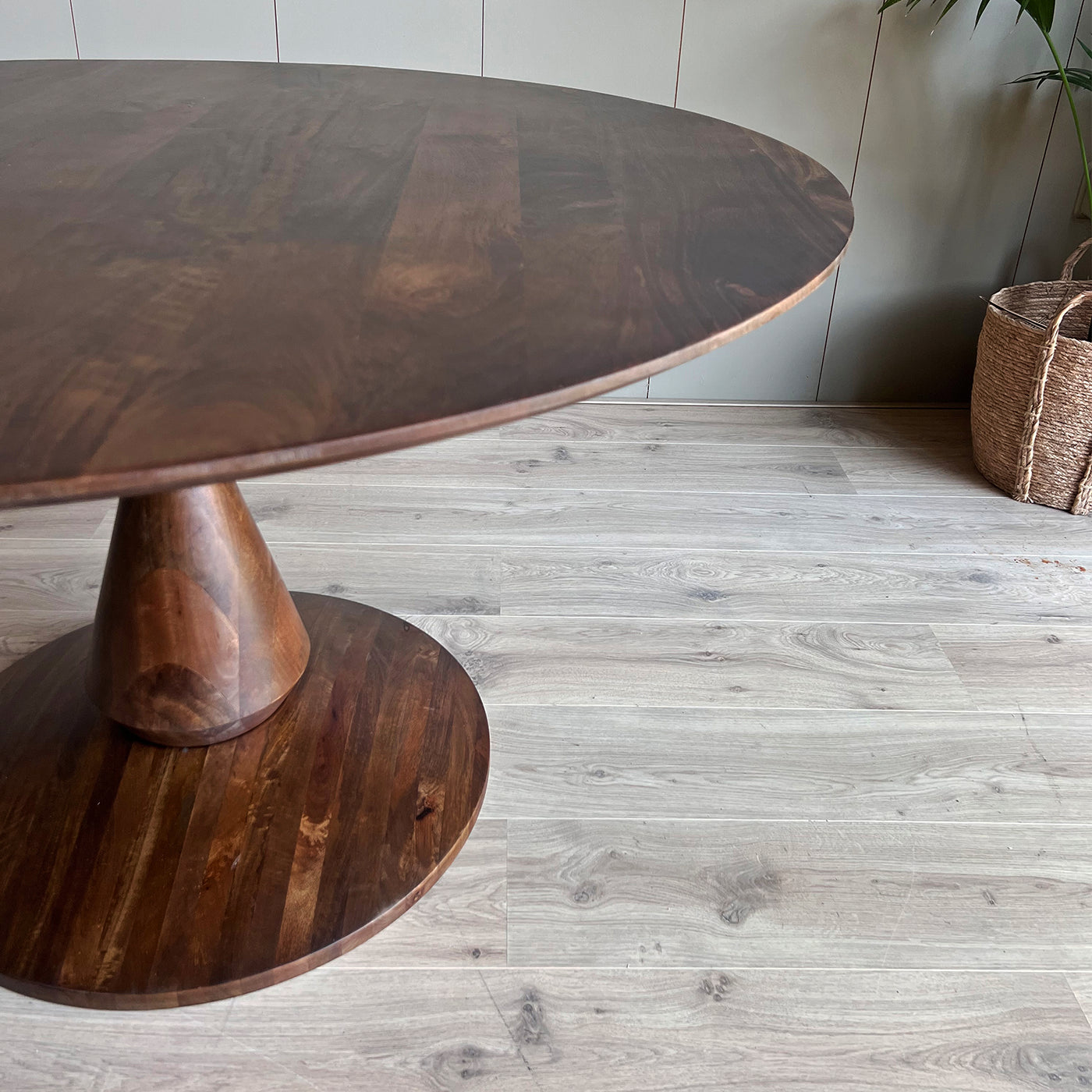De eetkamertafel is een ronde tafel van massief mango hout met een sierlijke vorm. Een bijzondere tafel, die direct opvalt door zijn design. De tafel heeft een centrale poot van massief mango hout. Een tafel die eenvoudig oogt, maar siert in de details. Doordat de tafel is behandeld in in een walnoot kleur geeft dit uw interieur een Hotel Chique uitstraling. De 6 persoonstafel heeft een diameter van 140cm en de tafel is 76cm hoog. Onderkant blad is 72cm Het tafelblad heeft een bladdikte van 4cm. Het tafelblad is gemaakt van massief mangohout en is niet opgedikt met een extra rand.
