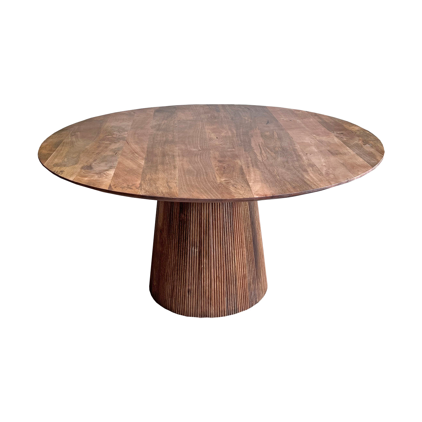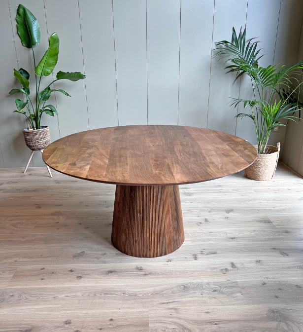 Eetkamertafel Rome is een prachtige ronde eettafel van mangohout in een bruine kleur. De ronde eettafel heeft een diameter van 150cm. Naast het ronde blad heeft eettafel Rome ook een ronde poot gemaakt van mangohout. Hierdoor kan je nog meer eetkamerstoelen plaatsen aan deze bijzondere en mooie eettafel. Doordat de tafel is glad is afgewerkt en daarna in een bruine kleur is gezet geeft dit uw interieur een chique maar ook een warme uitstraling! Maak jouw interieur compleet met een bijpassend tv meubel of de salontafel van onze serie Rome.