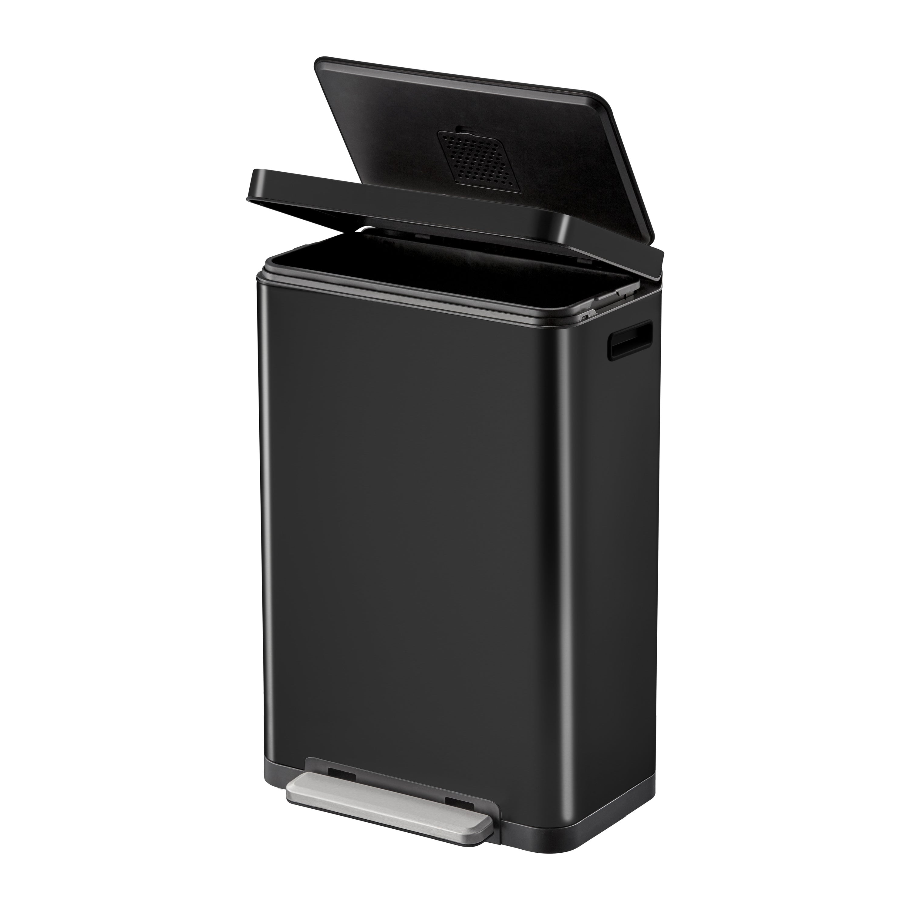 De zwarte X-Cube pedaalemmer met extra breed pedaal van EKO is een trendy, rechthoekige afvalbak met een kunststof binnenbak van 30 L. Dit is een ideale vuilnisbak voor elke moderne keuken. Bovendien is hij uitgerust met een geruisloos sluitend deksel en een openhoud-functie. De pedaalemmer is gemaakt van geborsteld roestvrij staal en heeft een ingenieuze, vingerafdrukbestendige coating en een nanozilver anti-bacteriële coating. Verder zorgt de siliconen afdichtingsring ervoor dat nare geurtjes effectief worden vastgehouden in de afvalbak. Ook zit er een ingebouwd geurfilter in het deksel. Verder houdt de vouwrand de bak open voor het eenvoudig verwisselen van de afvalzak en/of het verwijderen van de binnenbak.