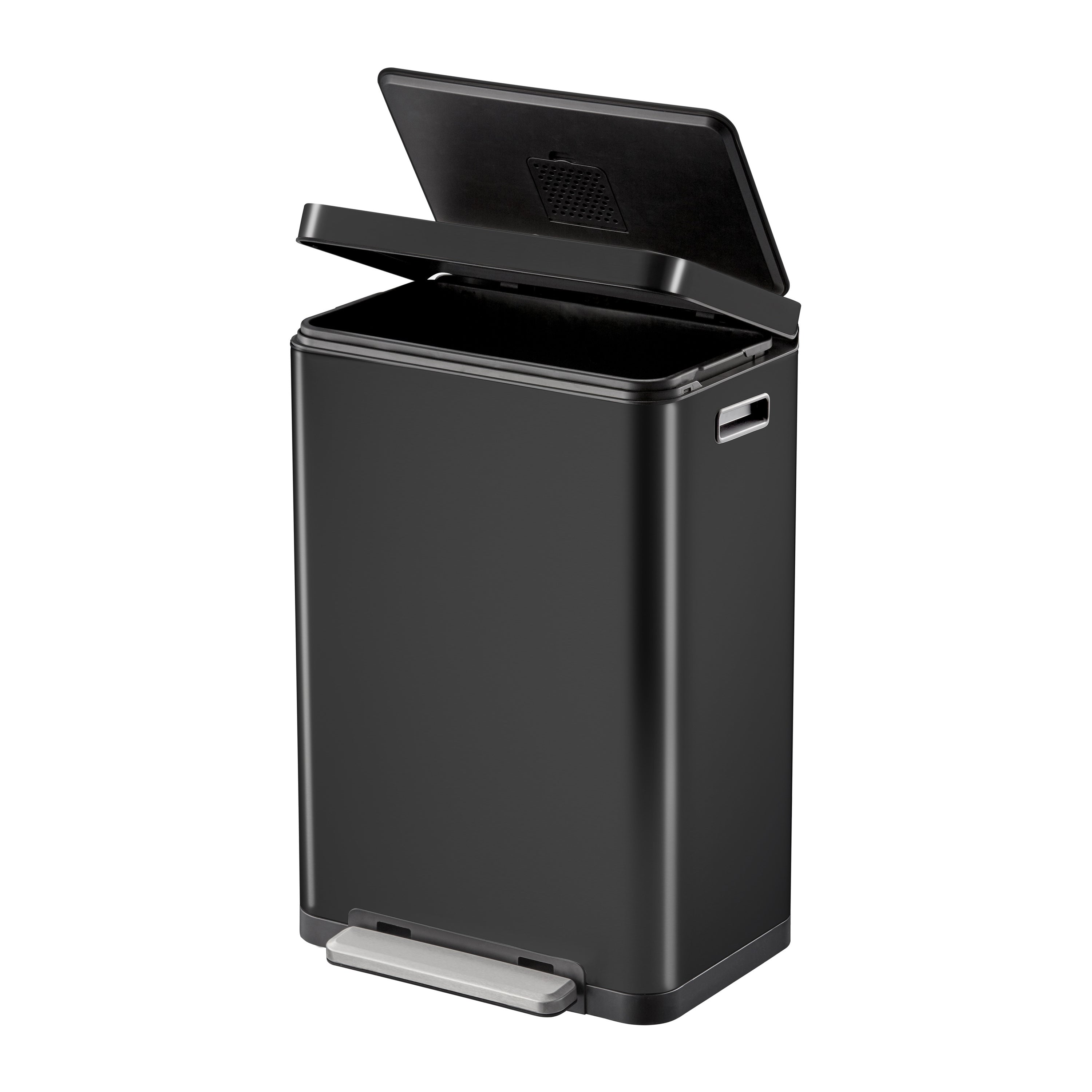 De zwarte X-Cube pedaalemmer met extra breed pedaal van EKO is een trendy, rechthoekige afvalbak met een kunststof binnenbak van 45 L. Dit is een ideale vuilnisbak voor elke moderne keuken. Bovendien is hij uitgerust met een geruisloos sluitend deksel en een openhoud-functie. De pedaalemmer is gemaakt van geborsteld roestvrij staal en heeft een ingenieuze, vingerafdrukbestendige coating en een nanozilver anti-bacteriële coating. Verder zorgt de siliconen afdichtingsring ervoor dat nare geurtjes effectief worden vastgehouden in de afvalbak. Ook zit er een ingebouwd geurfilter in het deksel. Verder houdt de vouwrand de bak open voor het eenvoudig verwisselen van de afvalzak en/of het verwijderen van de binnenbak.