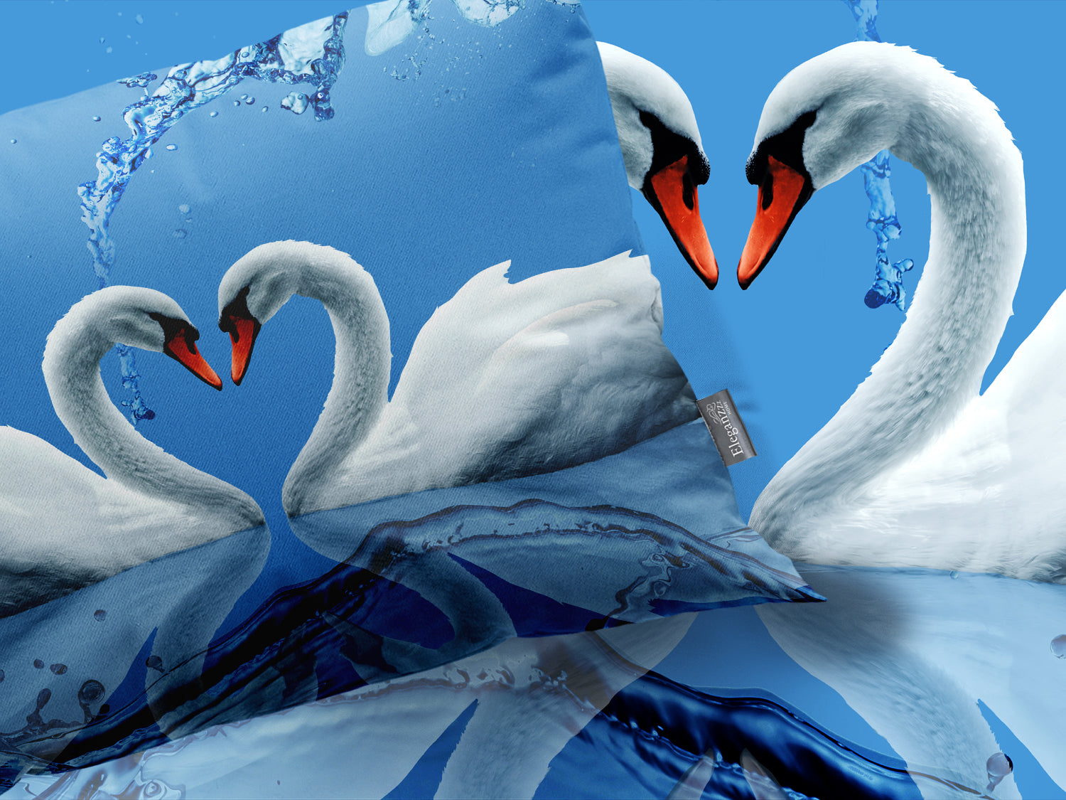 Twee elegante zwanen vormen met hun nekken een perfect hart, hun weerspiegeling rustig rustend op het blauwe water van het dekbedovertrek.