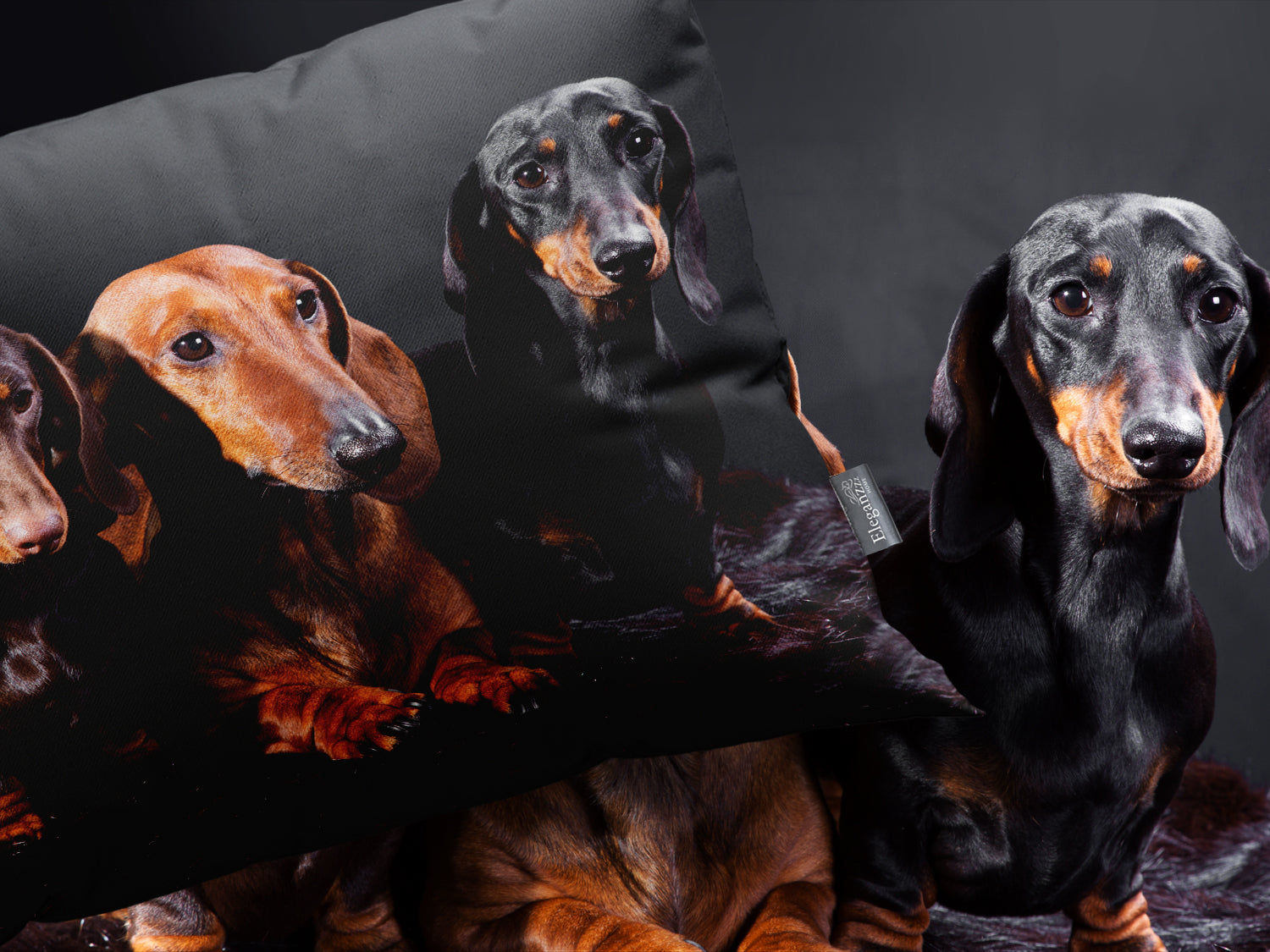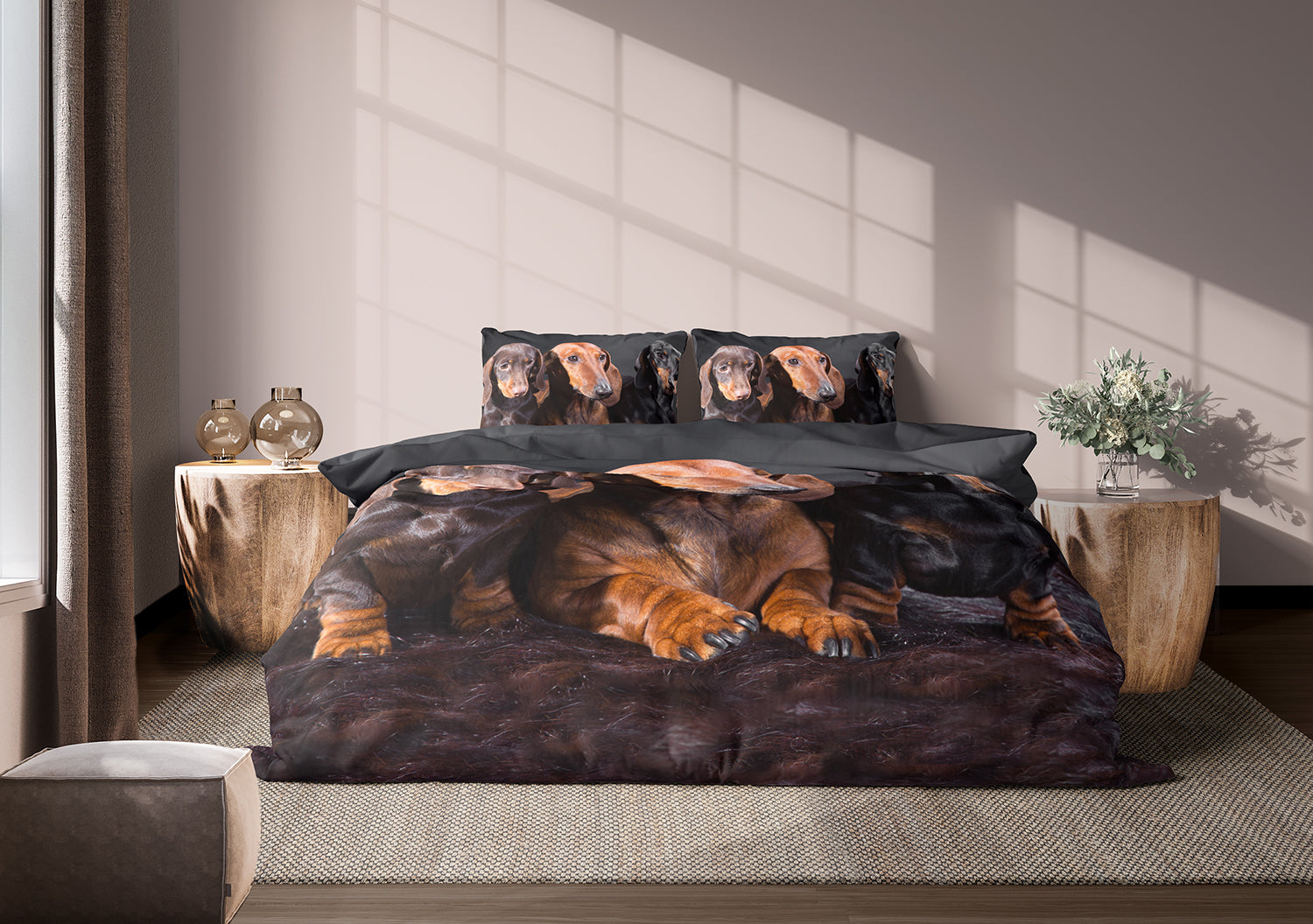 Deze drie schattige teckels komen tot leven vol karakter en charme. Dit trio springt speels in het oog tegen de diepe zwarte achtergrond van het dekbedovertrek.