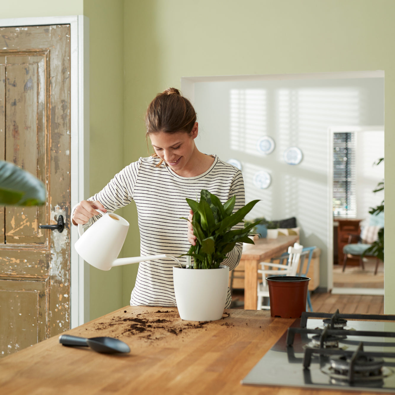 Zo werkt het Allereerst vul je de self-watering pot met aarde en een mooie plant. Daarna zet je de insert in zijn geheel in een bloempot naar wens. Hij past in de meeste elho potten en ook andere potten van bijvoorbeeld keramiek. Vervolgens vul je de insert met water waarna je plant wekenlang voor zichzelf zorgt. Handig, als je op vakantie gaat (of geen groene vingers hebt)! De watermeter geeft vanzelf aan wanneer het tijd is om water bij te vullen. Dag plantenstress!