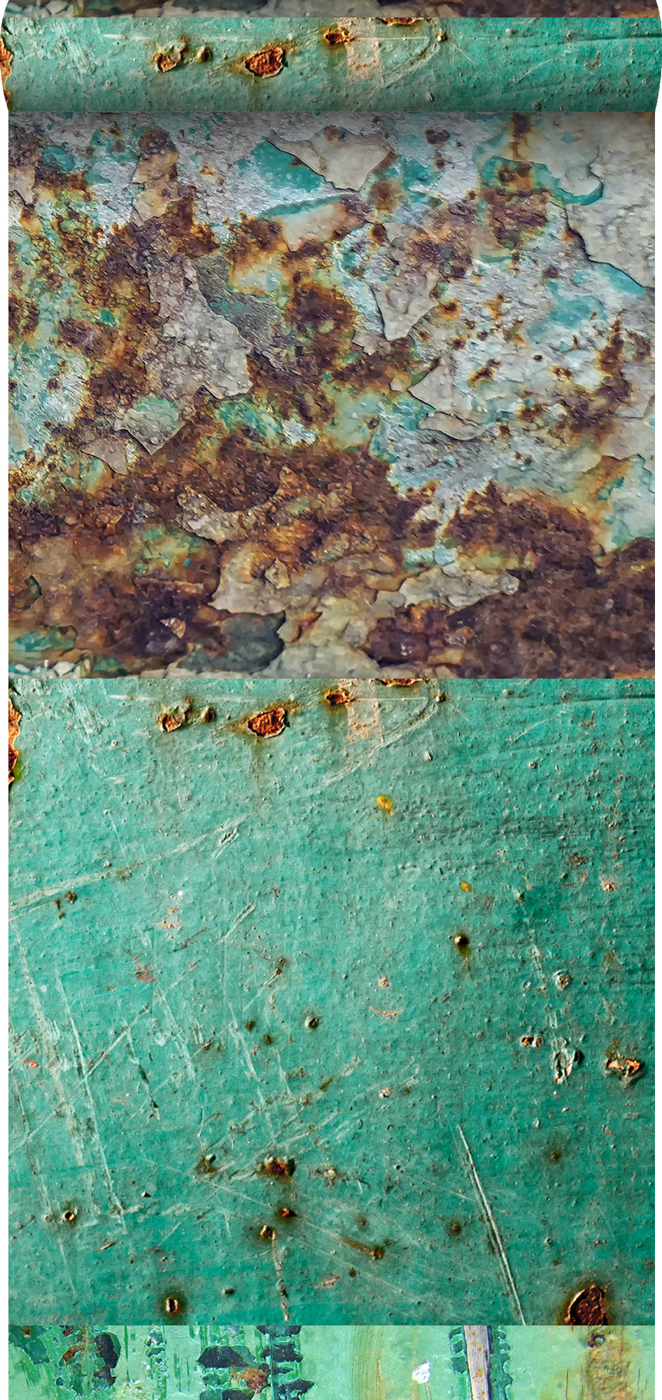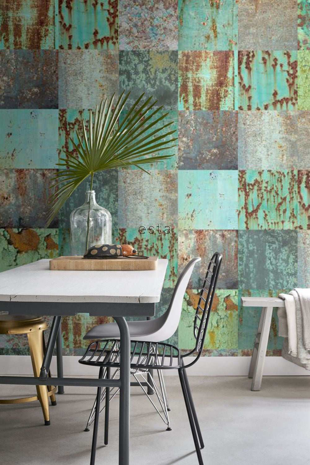 ESTAhome XXL behang patchwork roestige metalen platen zeegroen en brui