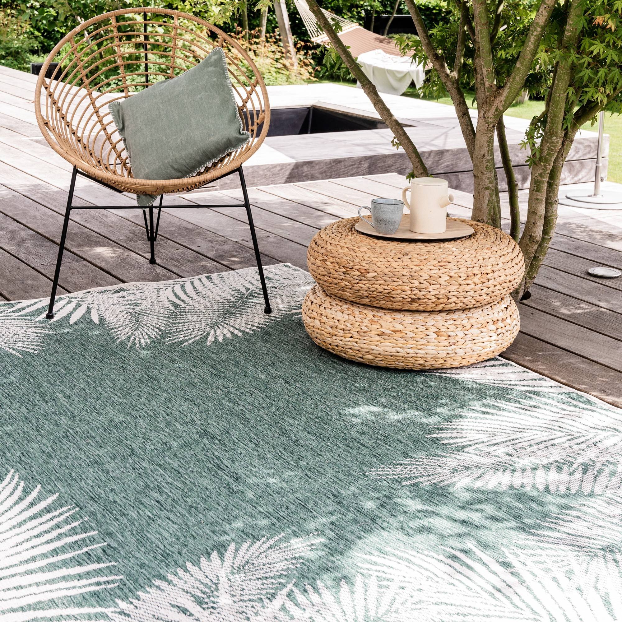 Wat leuk is aan de buitenvloerkleden van Eva Interior is dat ze dubbelzijdig te gebruiken zijn, in een handomdraai heb jij dus een totaal ander kleed met tegengestelde kleuren!