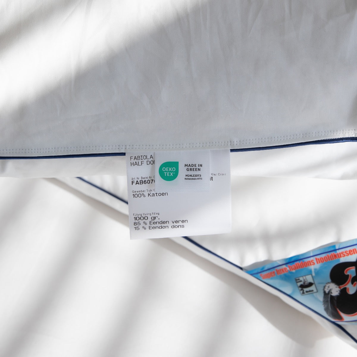 Duik in een nacht van luxueus comfort en perfecte ondersteuning met het Fabiola halfdons hoofdkussen. Een sublieme balans die voortkomt uit de combinatie van 85% ondersteunende eendenveren en 15% zacht, pofferig eendendons. Voel je elke nacht omringd door pure luxe.