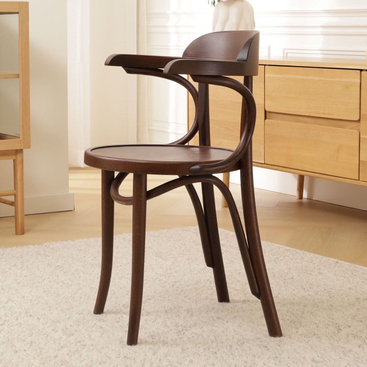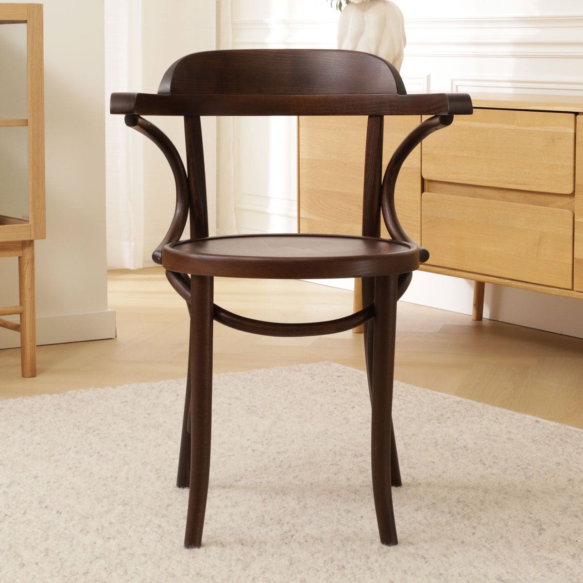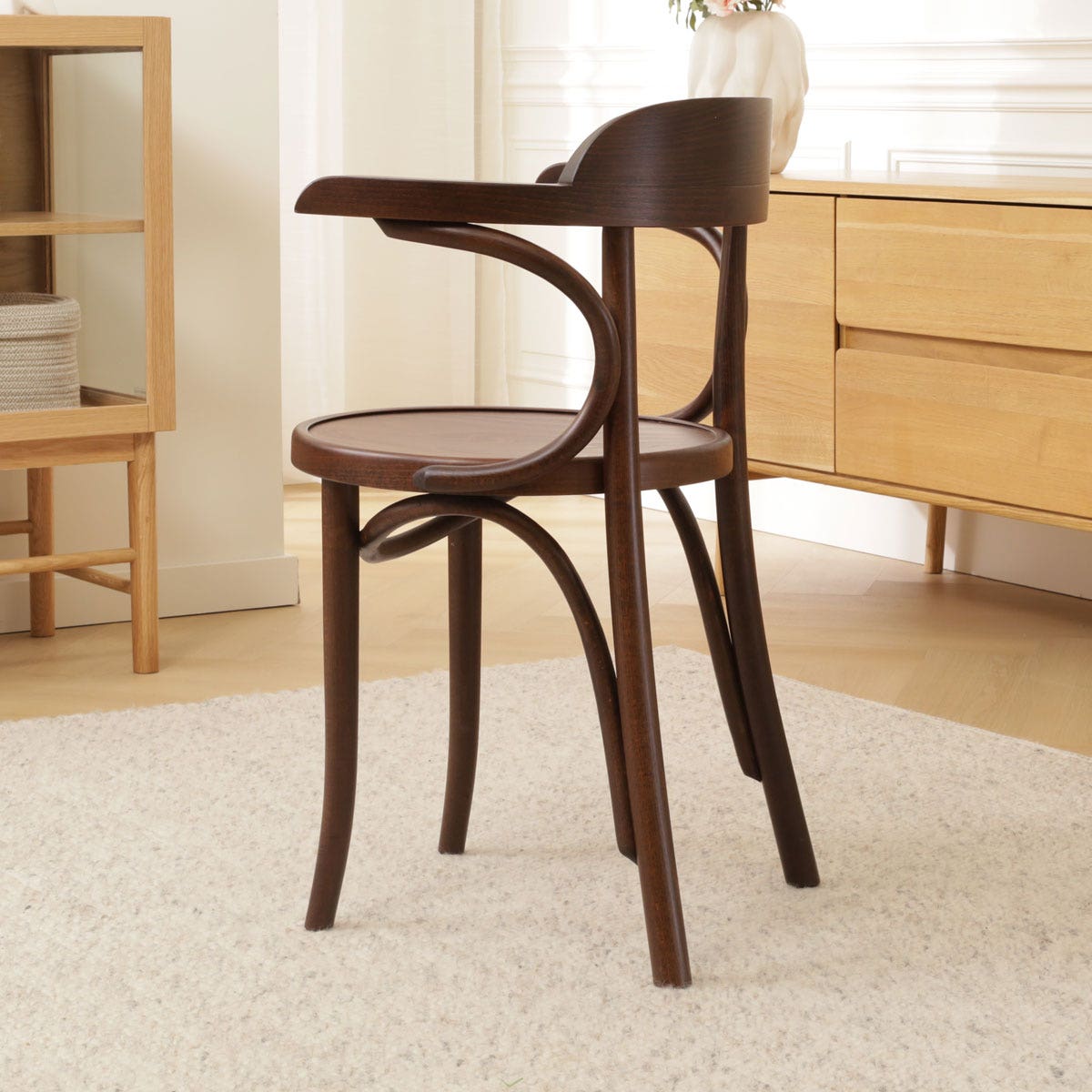 De ronde rugleuning zorgt ervoor dat je heerlijk kunt genieten van een avondje natafelen of een dag thuis werken zal ook geen probleem zijn in deze armstoel. Deze armstoel is gemaakt van sterk, gebogen beukenhout en door de rondingen krijgt de houten eetkamerstoel een klassieke touch. Door het mooie buighout en de armleuningen is dit een stoel met karakter. Kortom, hou jij van design en meubels met karakter, dan is deze stoel perfect voor jou!