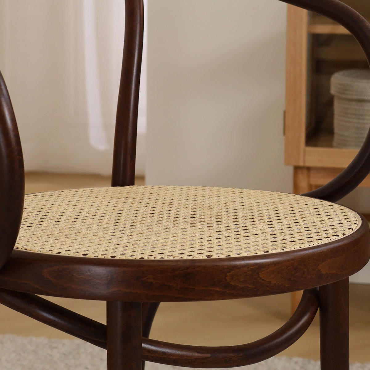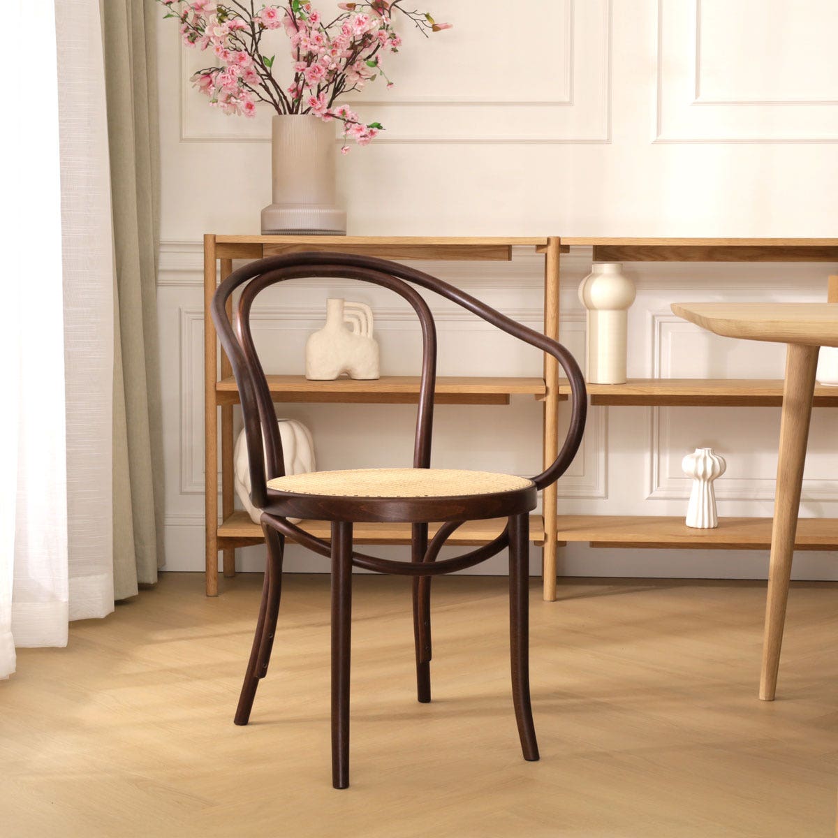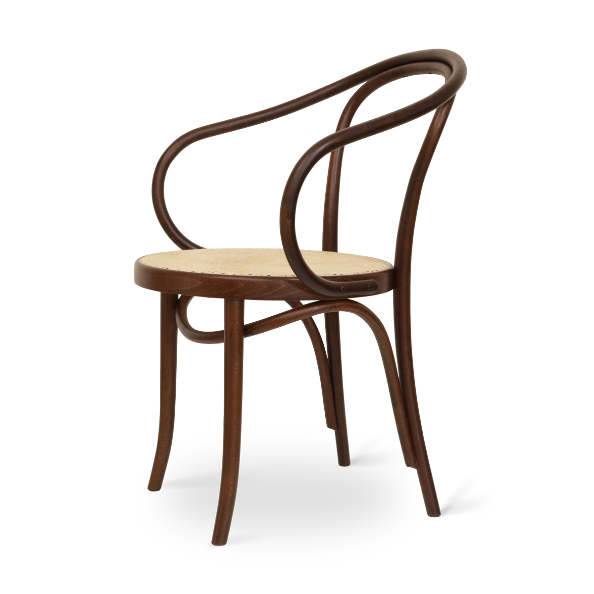 Het buighout van meubelpionier Michael Thonet zorgt voor een klassieke twist in deze armstoel. De zitting van de stoel is gemaakt van stevig verweven rotan en de stoel beschikt over afgewerkte armleuningen. In de 19e eeuw ontdekte Michael Thonet een nieuwe manier om hout te buigen. Door met minder houtverbindingen en zonder lijm te werken, maakte hij meubels veel steviger, hierdoor zijn deze stoelen uniek! De met rotan verweven zitting maakt het zitten prettiger, waardoor je lekker lang kunt natafelen. Bovendien is de stoel verkrijgbaar in meerdere afwerkingen, waardoor er altijd een stoel is die bij jouw interieur past.