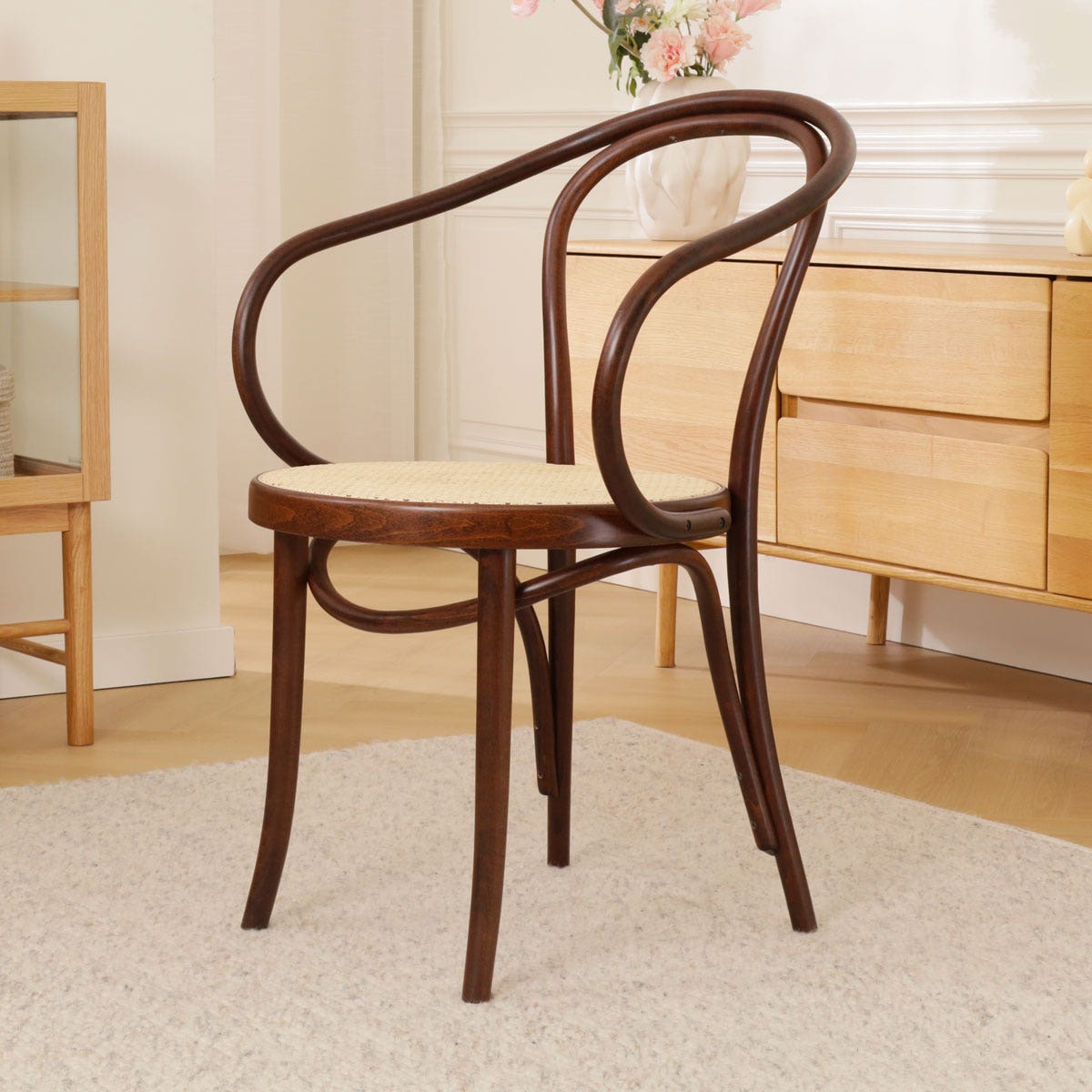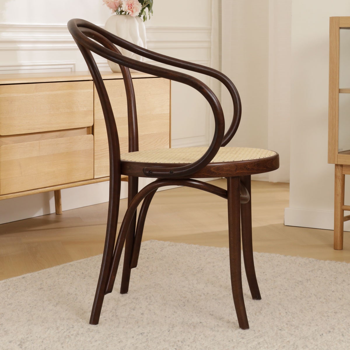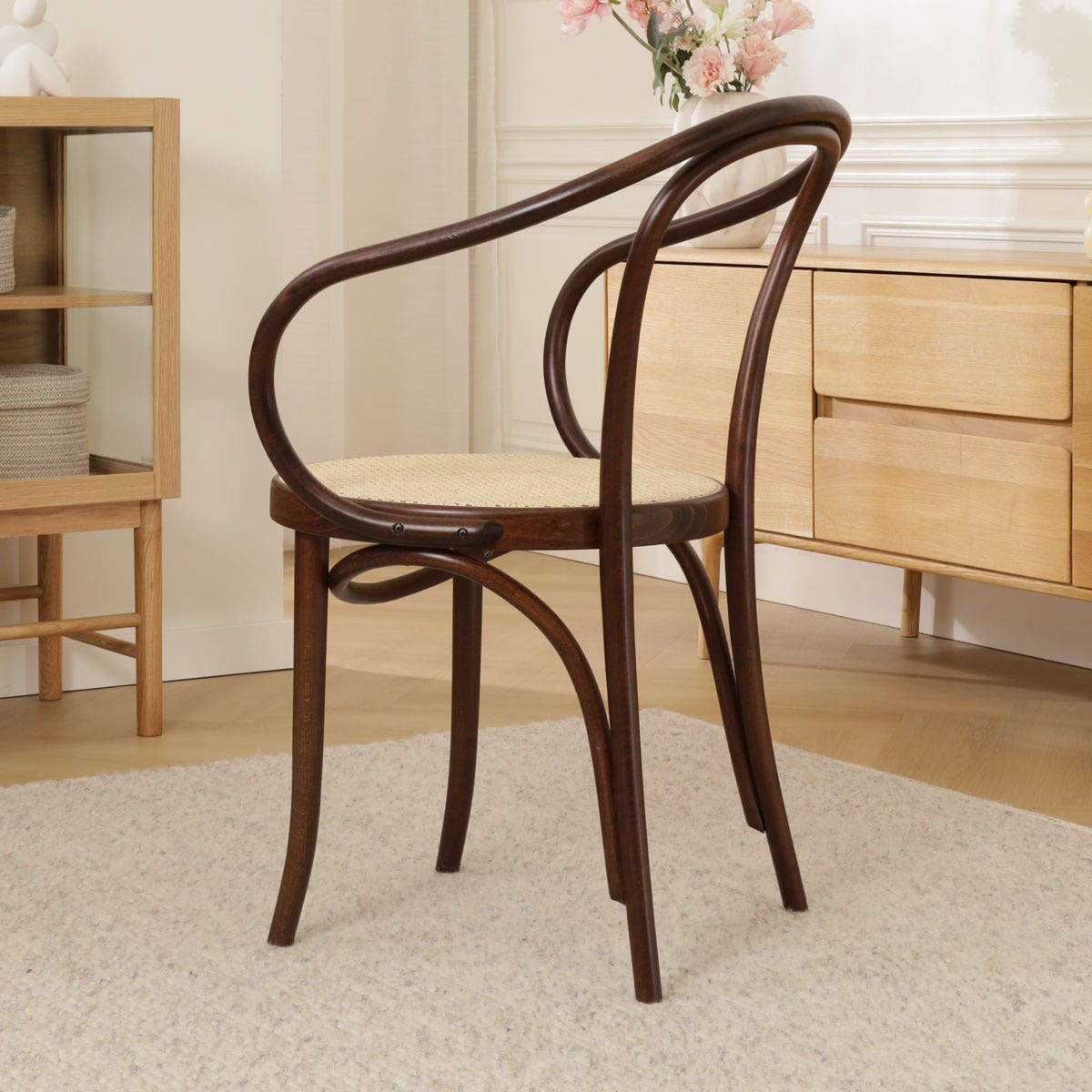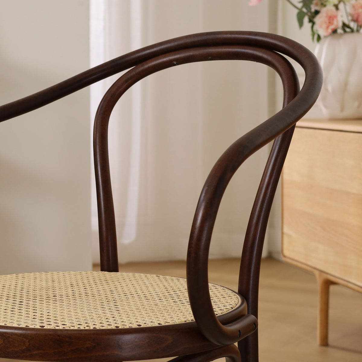 Het buighout van meubelpionier Michael Thonet zorgt voor een klassieke twist in deze armstoel. De zitting van de stoel is gemaakt van stevig verweven rotan en de stoel beschikt over afgewerkte armleuningen. In de 19e eeuw ontdekte Michael Thonet een nieuwe manier om hout te buigen. Door met minder houtverbindingen en zonder lijm te werken, maakte hij meubels veel steviger, hierdoor zijn deze stoelen uniek! De met rotan verweven zitting maakt het zitten prettiger, waardoor je lekker lang kunt natafelen. Bovendien is de stoel verkrijgbaar in meerdere afwerkingen, waardoor er altijd een stoel is die bij jouw interieur past.