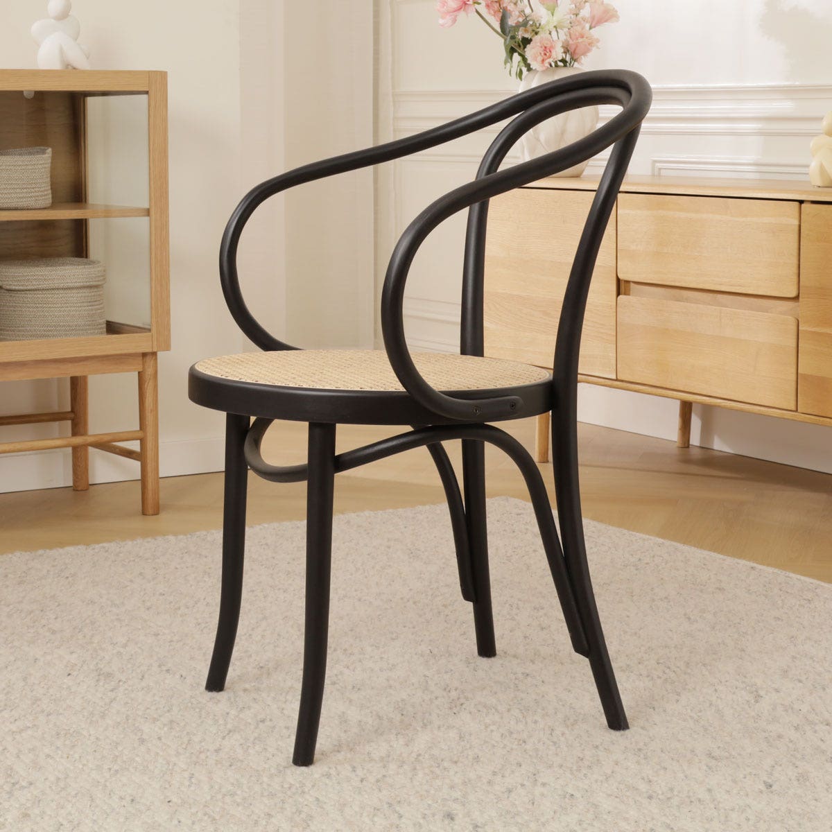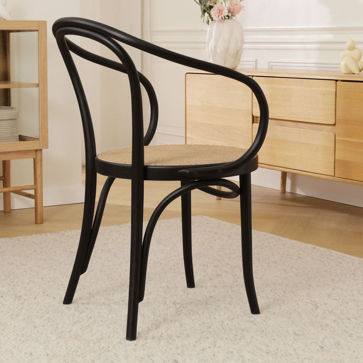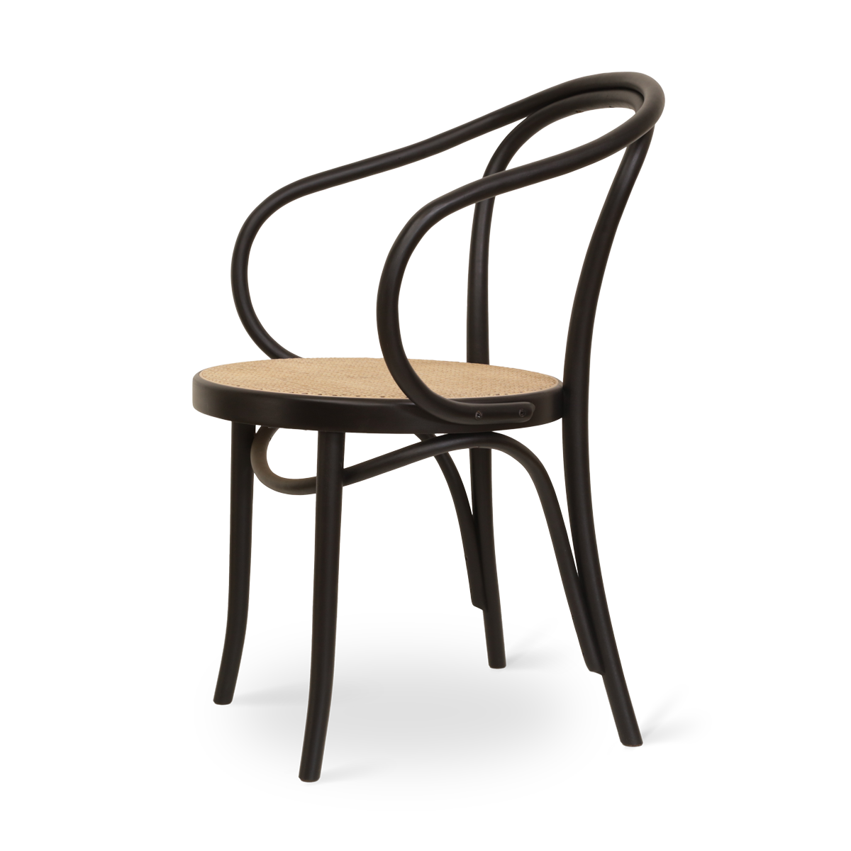 Het buighout van meubelpionier Michael Thonet zorgt voor een klassieke twist in deze armstoel. De zitting van de stoel is gemaakt van stevig verweven rotan en de stoel beschikt over afgewerkte armleuningen. In de 19e eeuw ontdekte Michael Thonet een nieuwe manier om hout te buigen. Door met minder houtverbindingen en zonder lijm te werken, maakte hij meubels veel steviger, hierdoor zijn deze stoelen uniek! De met rotan verweven zitting maakt het zitten prettiger, waardoor je lekker lang kunt natafelen. Bovendien is de stoel verkrijgbaar in meerdere afwerkingen, waardoor er altijd een stoel is die bij jouw interieur past.