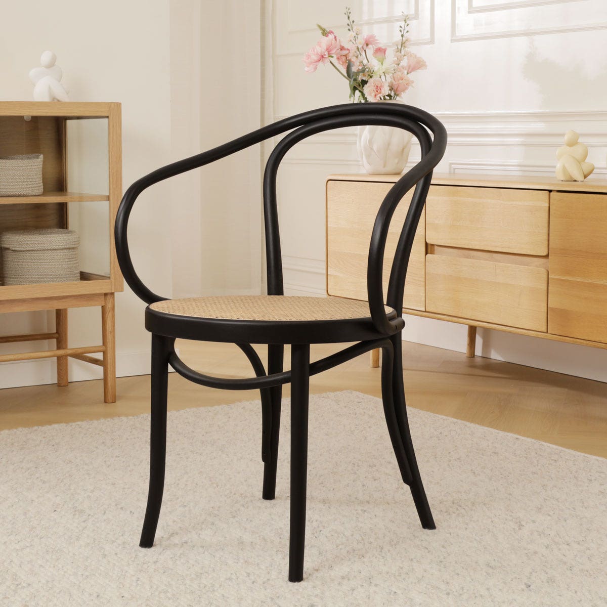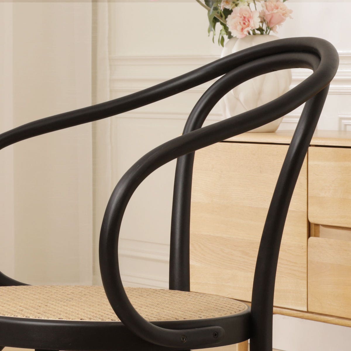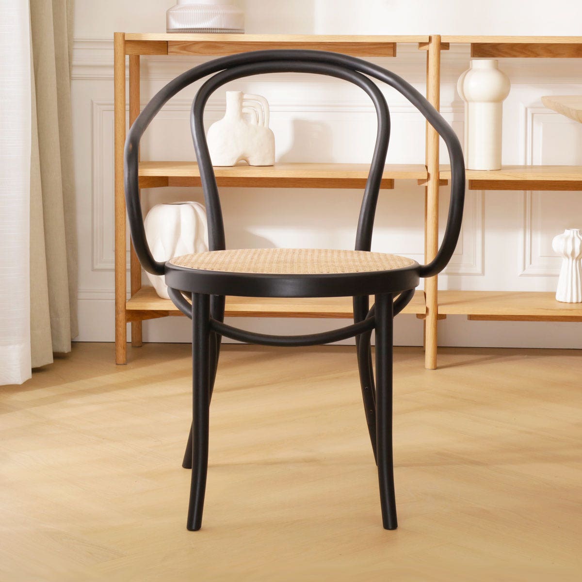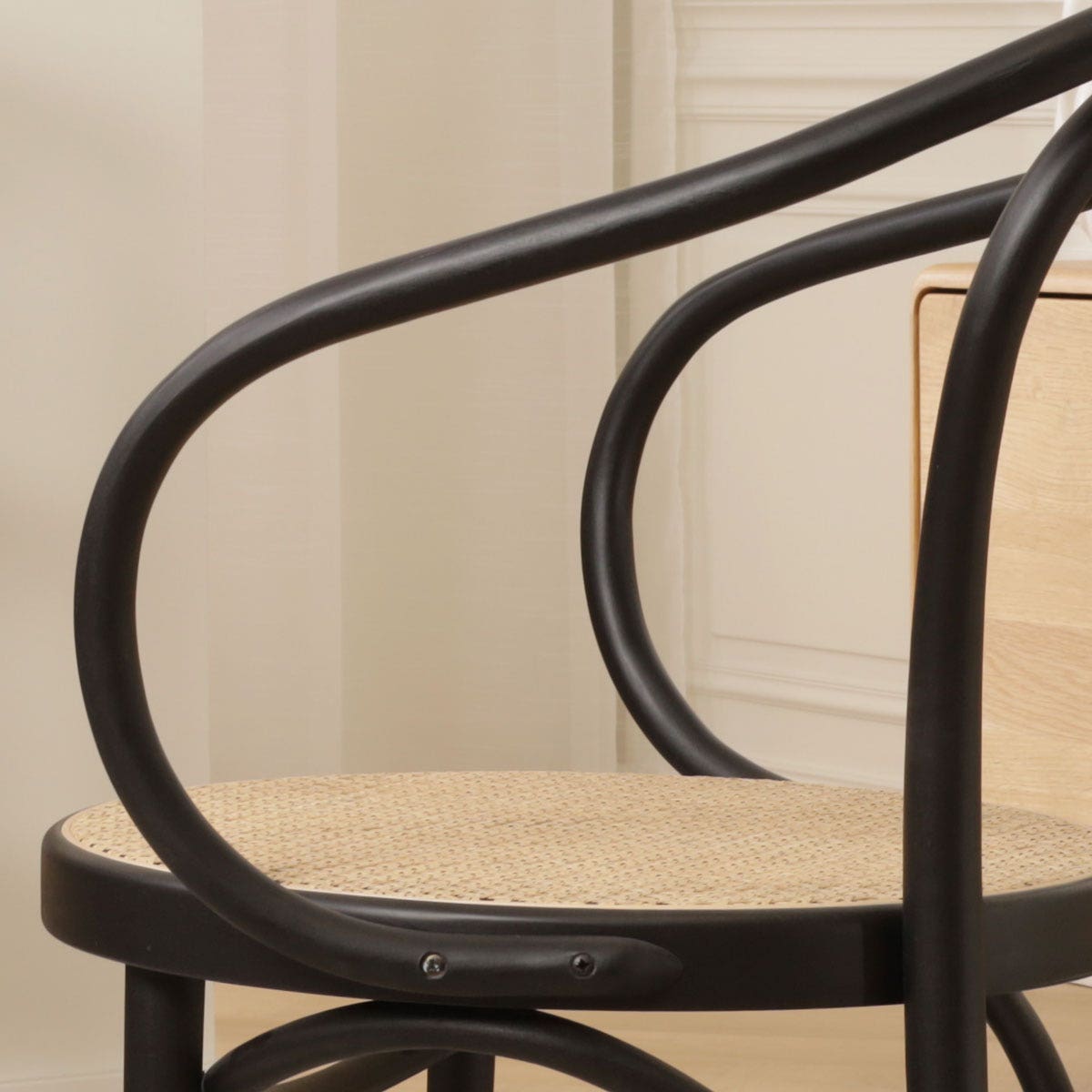 Het buighout van meubelpionier Michael Thonet zorgt voor een klassieke twist in deze armstoel. De zitting van de stoel is gemaakt van stevig verweven rotan en de stoel beschikt over afgewerkte armleuningen. In de 19e eeuw ontdekte Michael Thonet een nieuwe manier om hout te buigen. Door met minder houtverbindingen en zonder lijm te werken, maakte hij meubels veel steviger, hierdoor zijn deze stoelen uniek! De met rotan verweven zitting maakt het zitten prettiger, waardoor je lekker lang kunt natafelen. Bovendien is de stoel verkrijgbaar in meerdere afwerkingen, waardoor er altijd een stoel is die bij jouw interieur past.