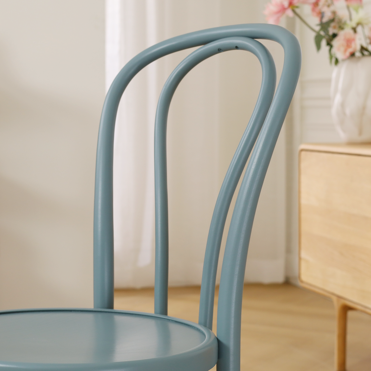 Deze superstevige houten cafe stoel, met de herkenbare lus in de rugleuning, past in ieder modern interieur. De ronde zitting zorgt voor een comfortabele zit. Het elegante, open design van de stoel maakt hem bovendien heel geschikt voor horecagebruik. Rond 1830 ontdekte meubelpionier Michael Thonet een nieuwe manier om hout te buigen. Door met minder houtverbindingen en zonder lijm te werken, maakte hij meubels veel steviger. Het merk Fameg zet dit werk voort in een van de originele Thonet-fabrieken uit 1881. Er zijn al 60 miljoen exemplaren van deze stoel verkocht, in allerlei materialen, kleuren en uitvoeringen. Het design en de duurzaamheid van deze stoel worden al jaren geroemd. Wist je bijvoorbeeld dat deze stoel favoriet was onder kunstenaars als Pablo Picasso?