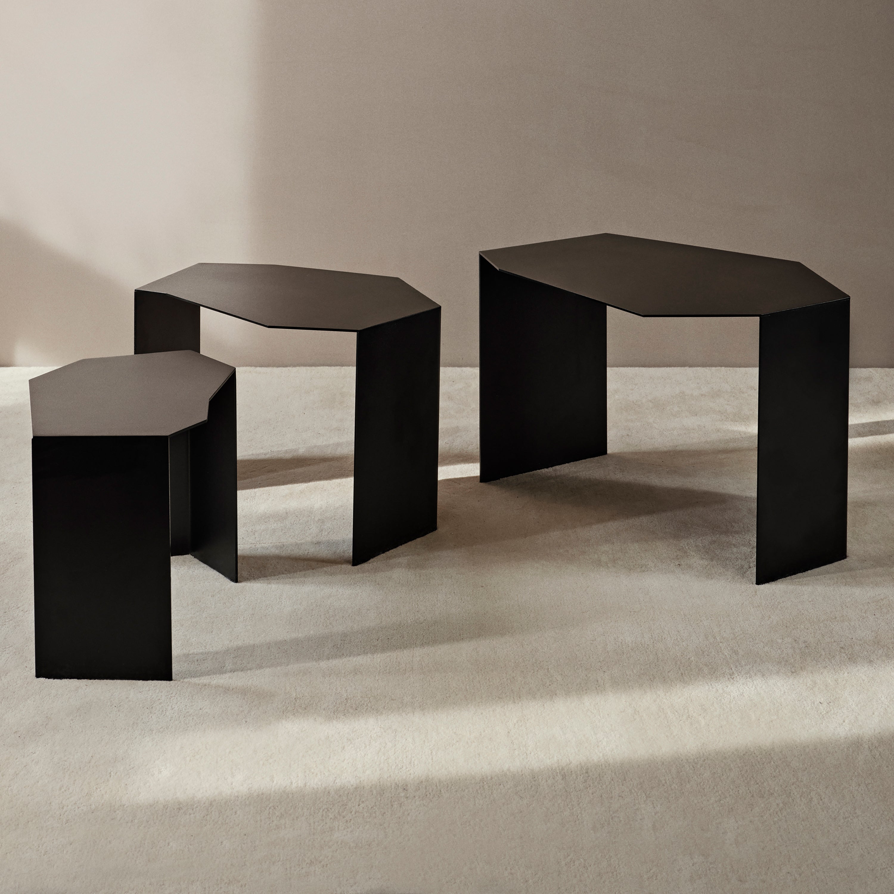 De Shard bijzettafels van ferm LIVING zijn geïnspireerd door de scherpe randen van gebroken keramiek. Plaats de tafels onder elkaar voor een strakke look of zet ze in een dynamische opstelling voor een speels effect!