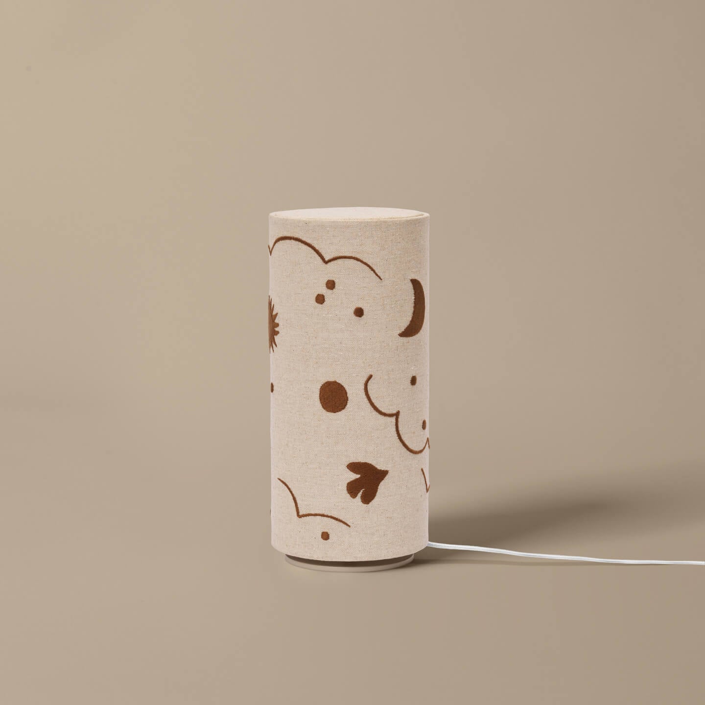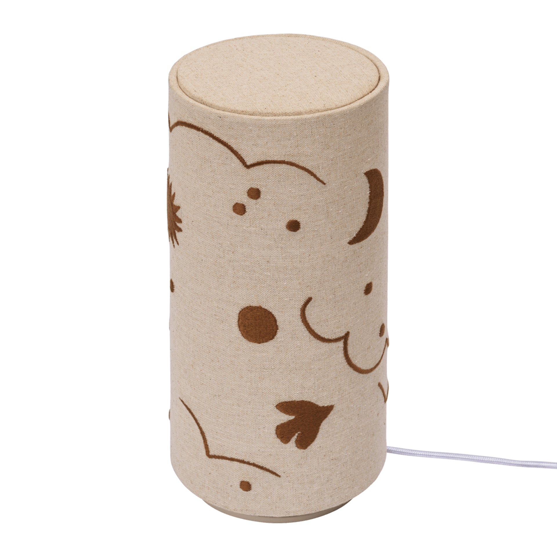 - Gepoedercoate ijzeren voet GOTS gecertificeerde linnen kap 12V LED lichtbron 2 meter witte stoffen kabel met dimmer