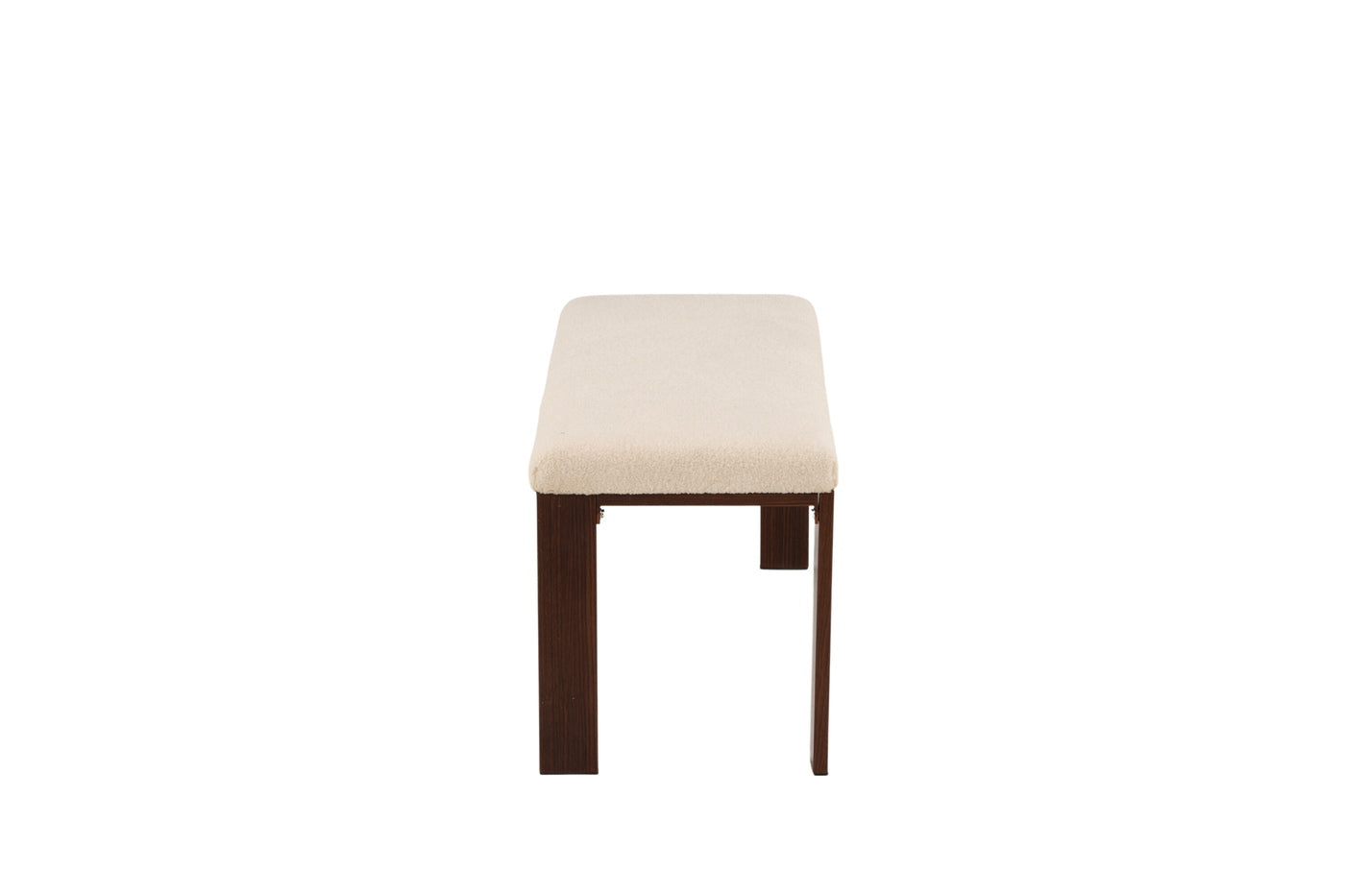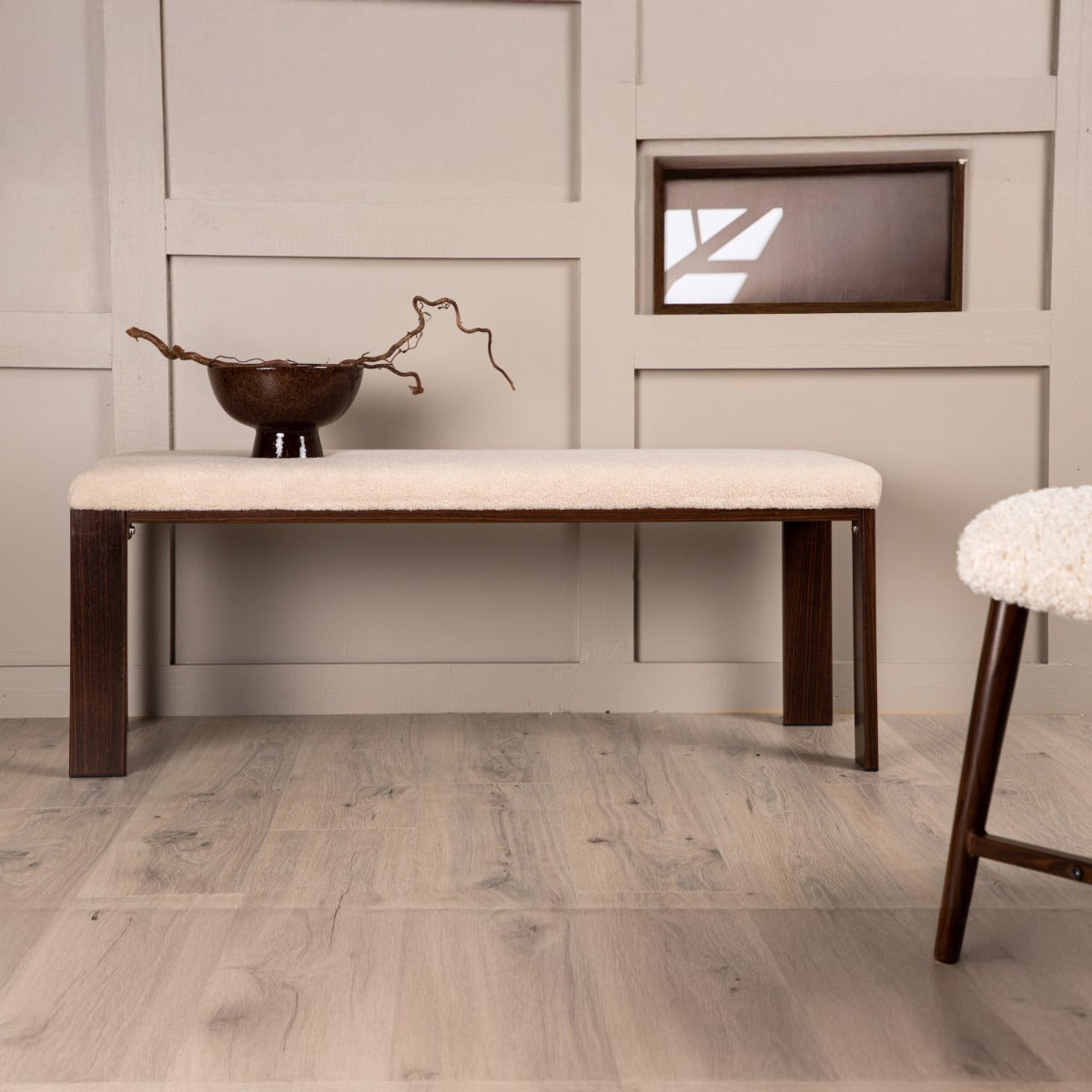 - Elegant bankje met een walnootkleurige afwerking en een zitting bekleed met off-white fleece.
