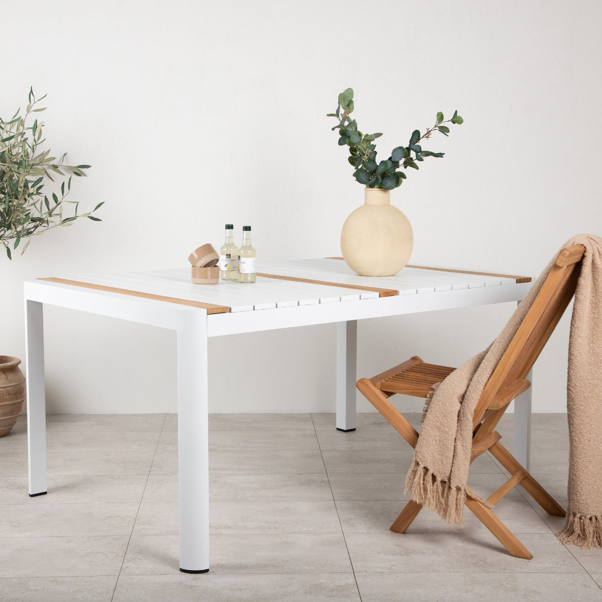 Maak kennis met de Fjôrd Eettafel Togo, een moderne eyecatcher die jouw eetkamer een frisse uitstraling geeft. Deze tafel combineert een strak wit aluminium onderstel met een prachtig teakhouten tafelblad. De witte kleur zorgt voor een tijdloze en elegante uitstraling, terwijl het teakhout een warme en natuurlijke touch toevoegt. Deze tafel is niet alleen stijlvol, maar ook van hoge kwaliteit en perfect voor dagelijks gebruik. Of je nu een gezellig diner organiseert of gewoon geniet van een kop koffie, de Fjôrd Eettafel Togo biedt de perfecte setting.