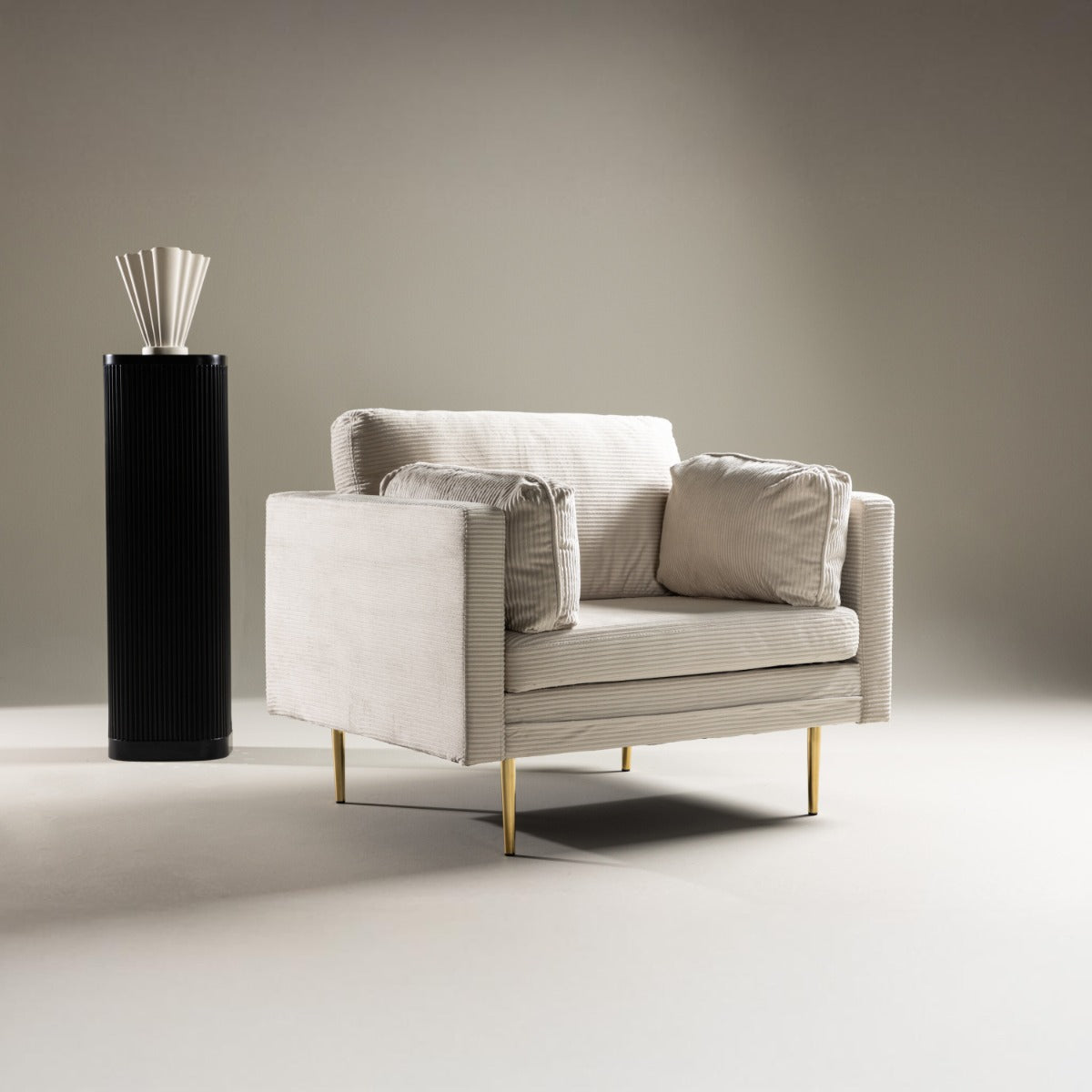 Ontdek de luxe van de Fjôrd Fauteuil Boom, een prachtige toevoeging aan je interieur in de stijl van Hotel Chique. Deze fauteuil, uitgevoerd in een elegante lichtgrijze ribstof, straalt verfijning en comfort uit. Het gouden onderstel voegt een vleugje glamour toe, waardoor het een eyecatcher in elke kamer is. De hoogwaardige ribstof zorgt voor een zachte en comfortabele zitervaring, perfect voor ontspannen momenten. Met zijn stijlvolle ontwerp en duurzame materialen is deze fauteuil een ideale keuze voor zowel moderne als klassieke interieurs.