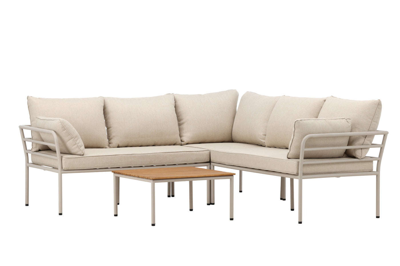 Materiaal: De loungeset is vervaardigd met een tafelblad van acaciahout, dat bekend staat om zijn duurzaamheid en natuurlijke schoonheid. Het onderstel is gemaakt van stevig staal, wat zorgt voor stabiliteit en een moderne uitstraling. Acaciahout krijgt van nature een wat rode gloed naarmate het wat ouder wordt.