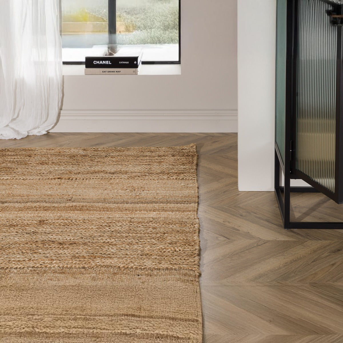 Materiaal: Het vloerkleed is vervaardigd uit jute, een stevig en natuurlijk materiaal dat bekend staat om zijn duurzaamheid en milieuvriendelijkheid. Jute is een uitstekende keuze voor vloerkleden, omdat het zowel stijlvol als functioneel is.