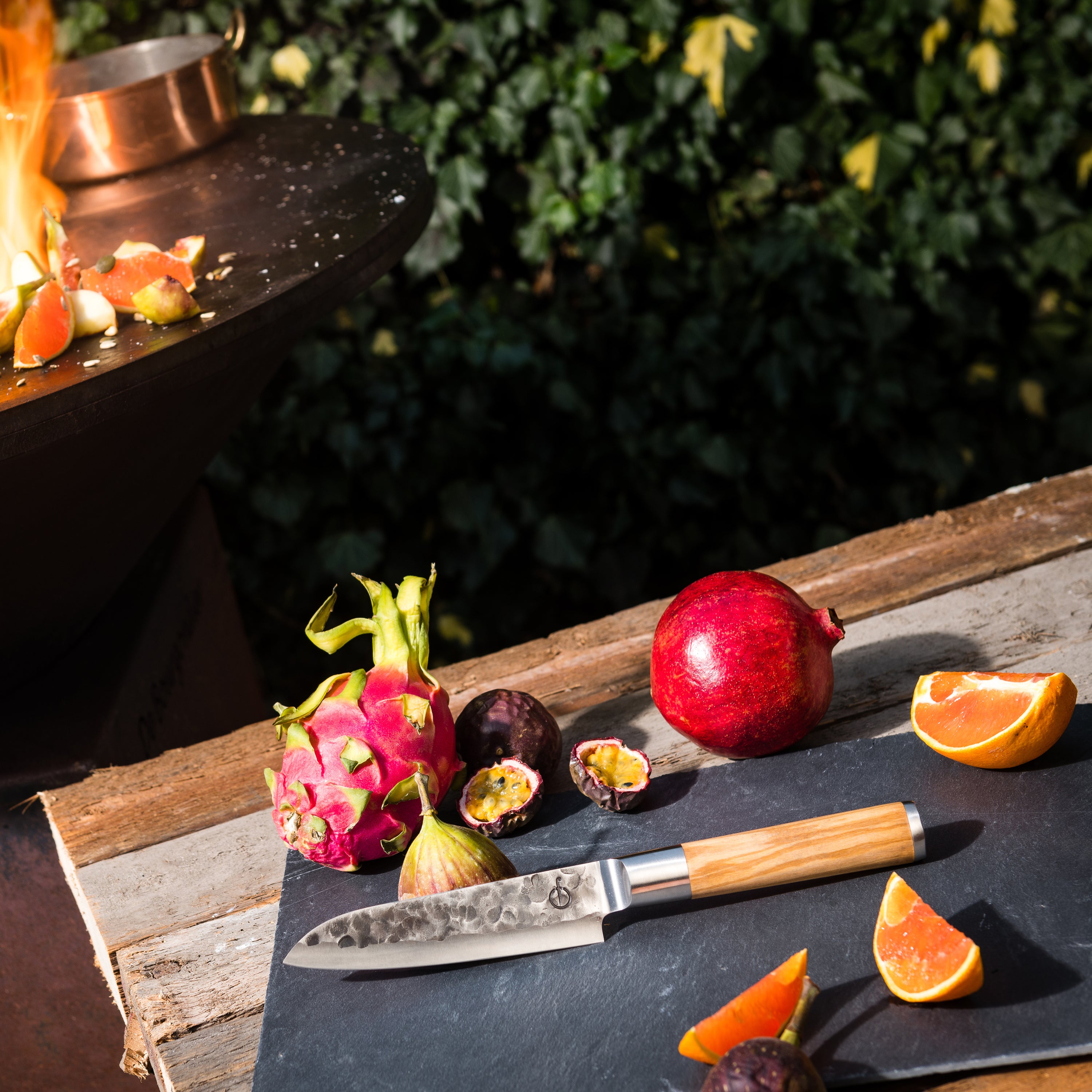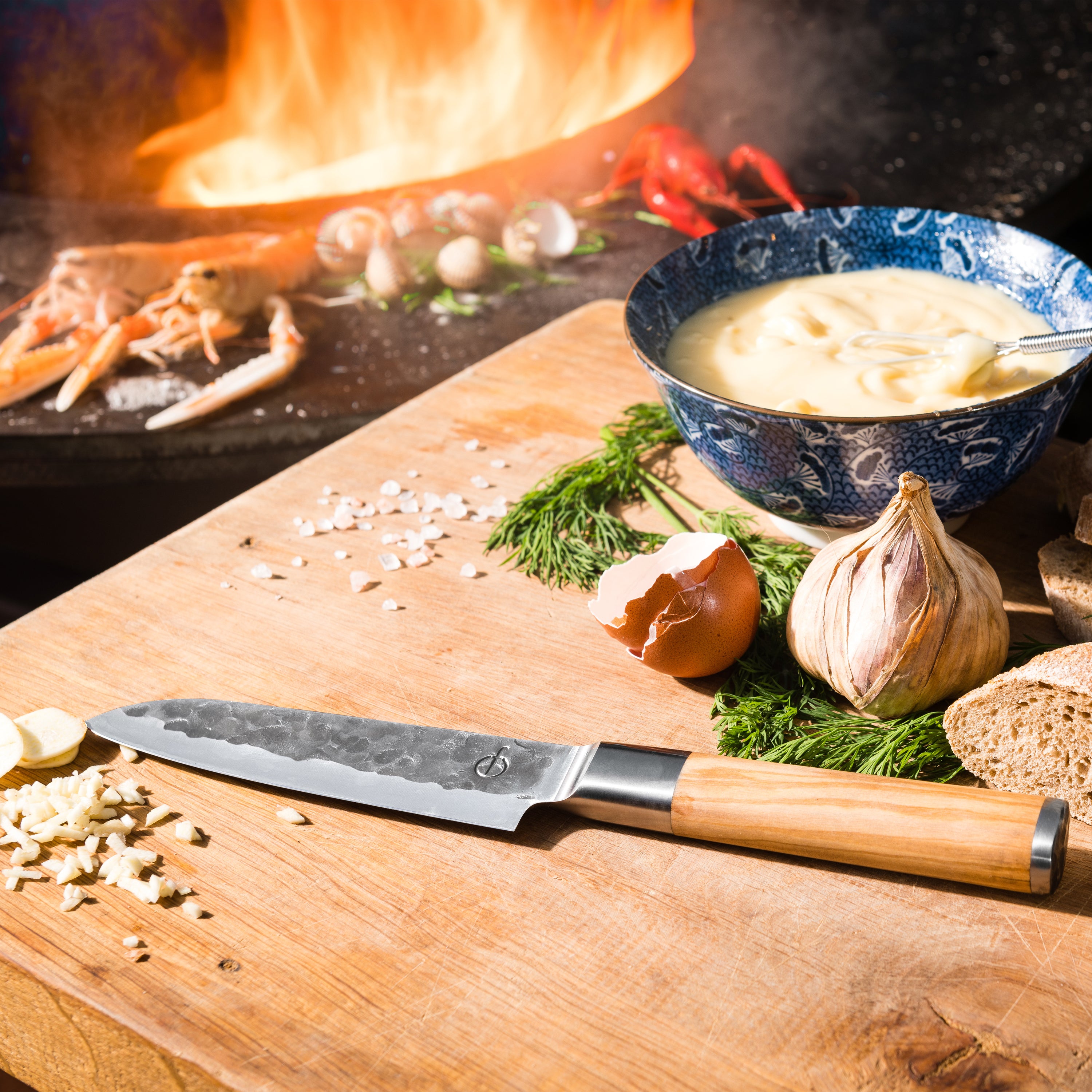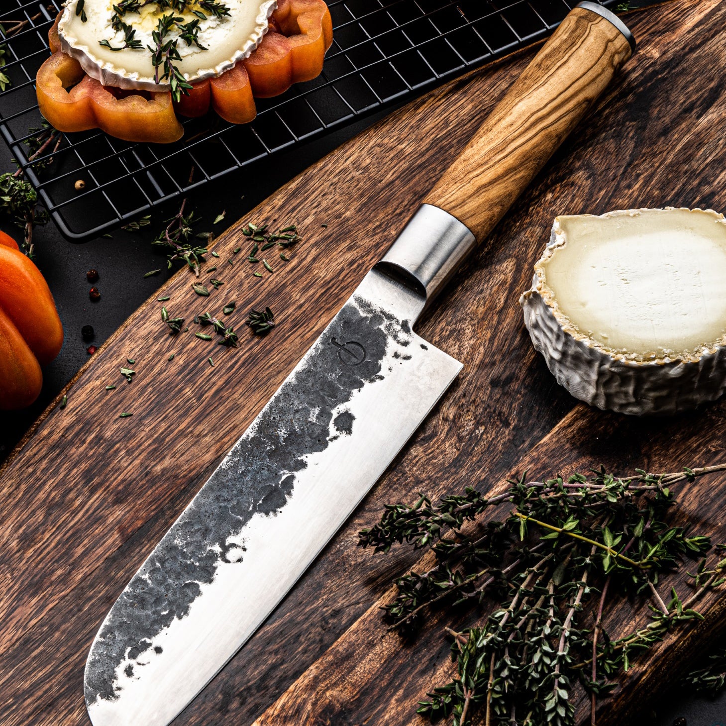 - Hij is met de hand gesmeed en heeft een olijfhouten handvat